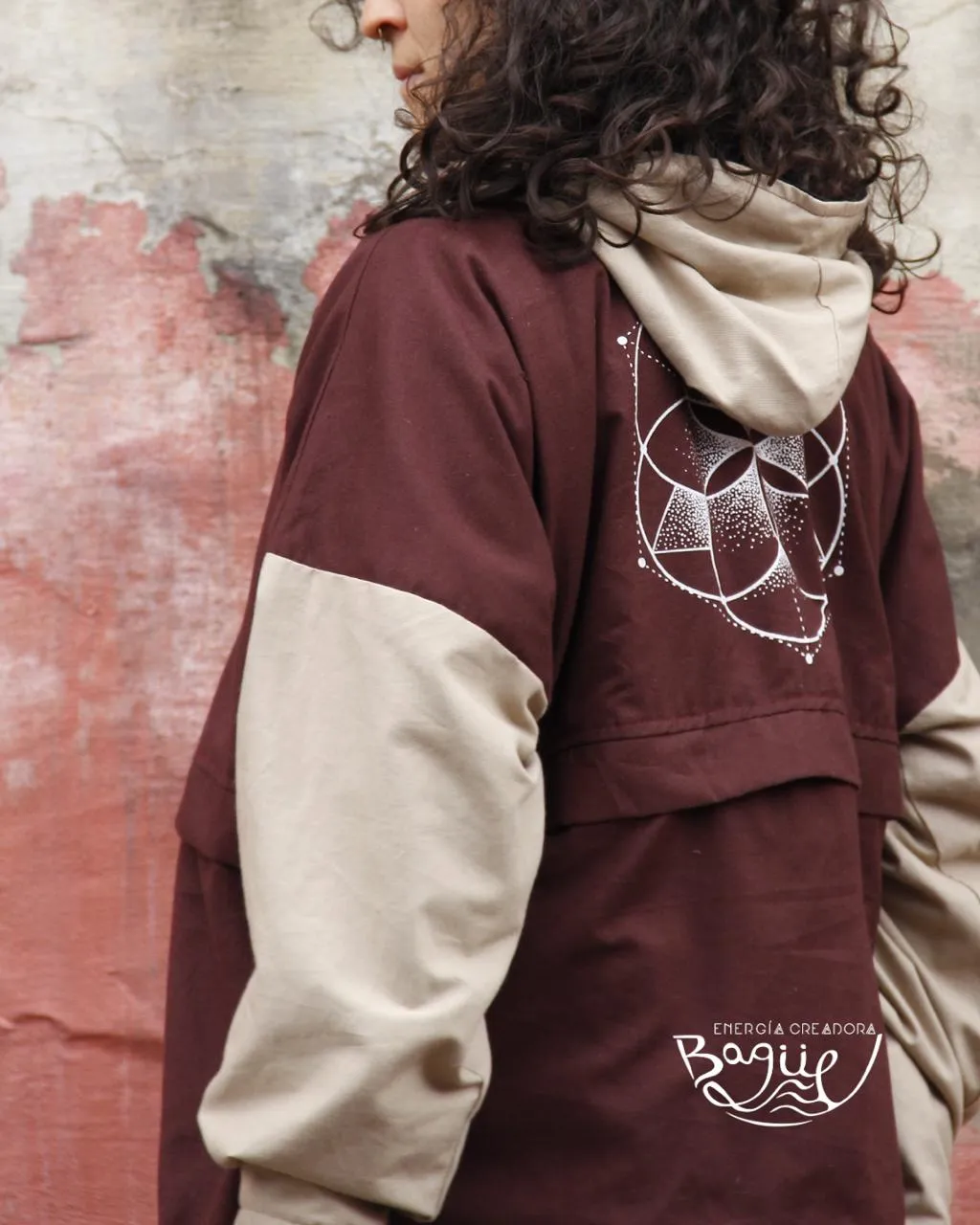 Abrigo Oversize cálido y forrado, diseño Cero Residuos con simbología de la Semilla de la Vida.