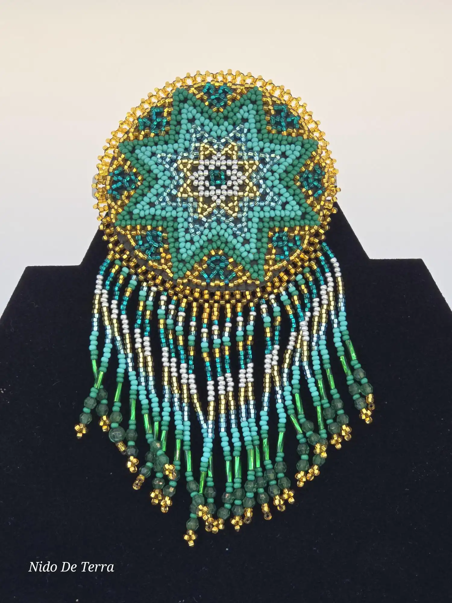 Una elegante cascada de flecos cuelga de la base, utilizando una mezcla de chaquira en tonos turquesa, verde, blanco y dorado. Los flecos terminan con grupos de cuentas más grandes en verde y pequeños toques dorados que aseguran un movimiento fluido.