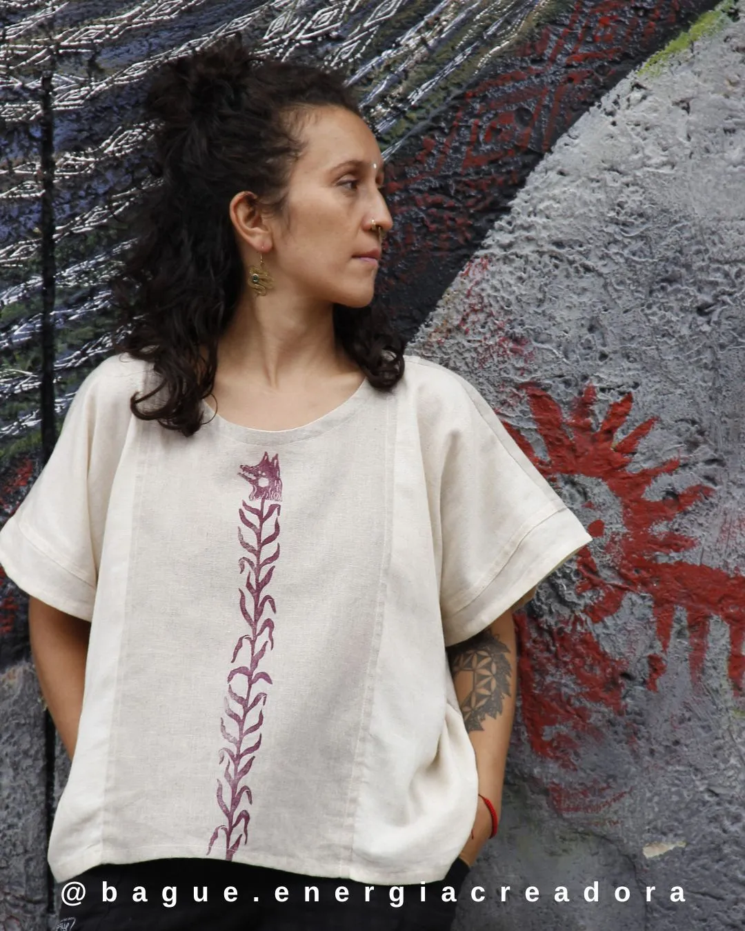 Blusa Zero Residuo con estampado de Maíz y Loba, simboliza el crecimiento después de la oscuridad.