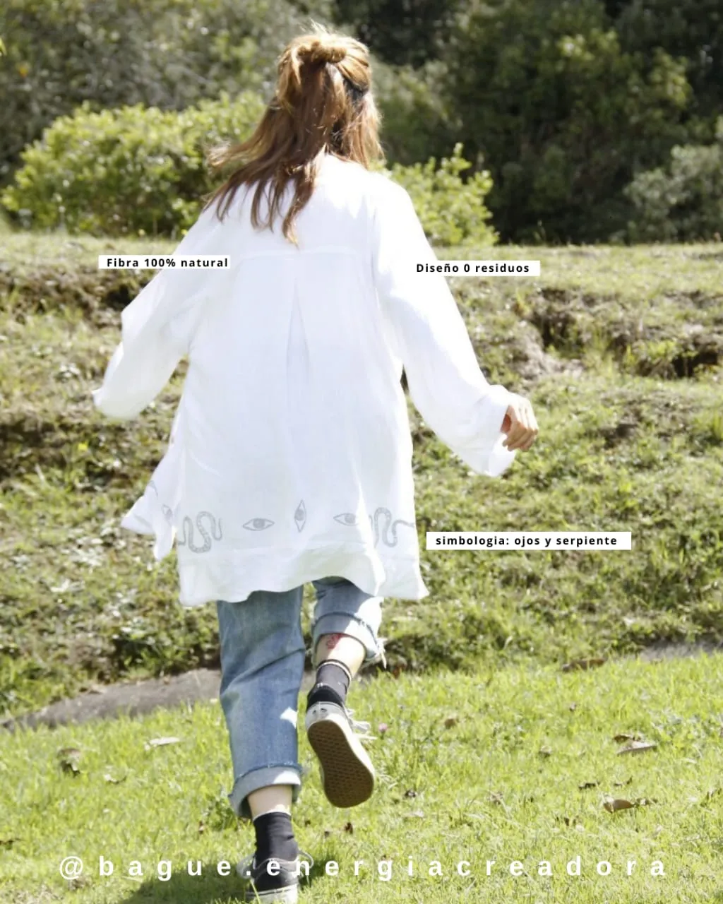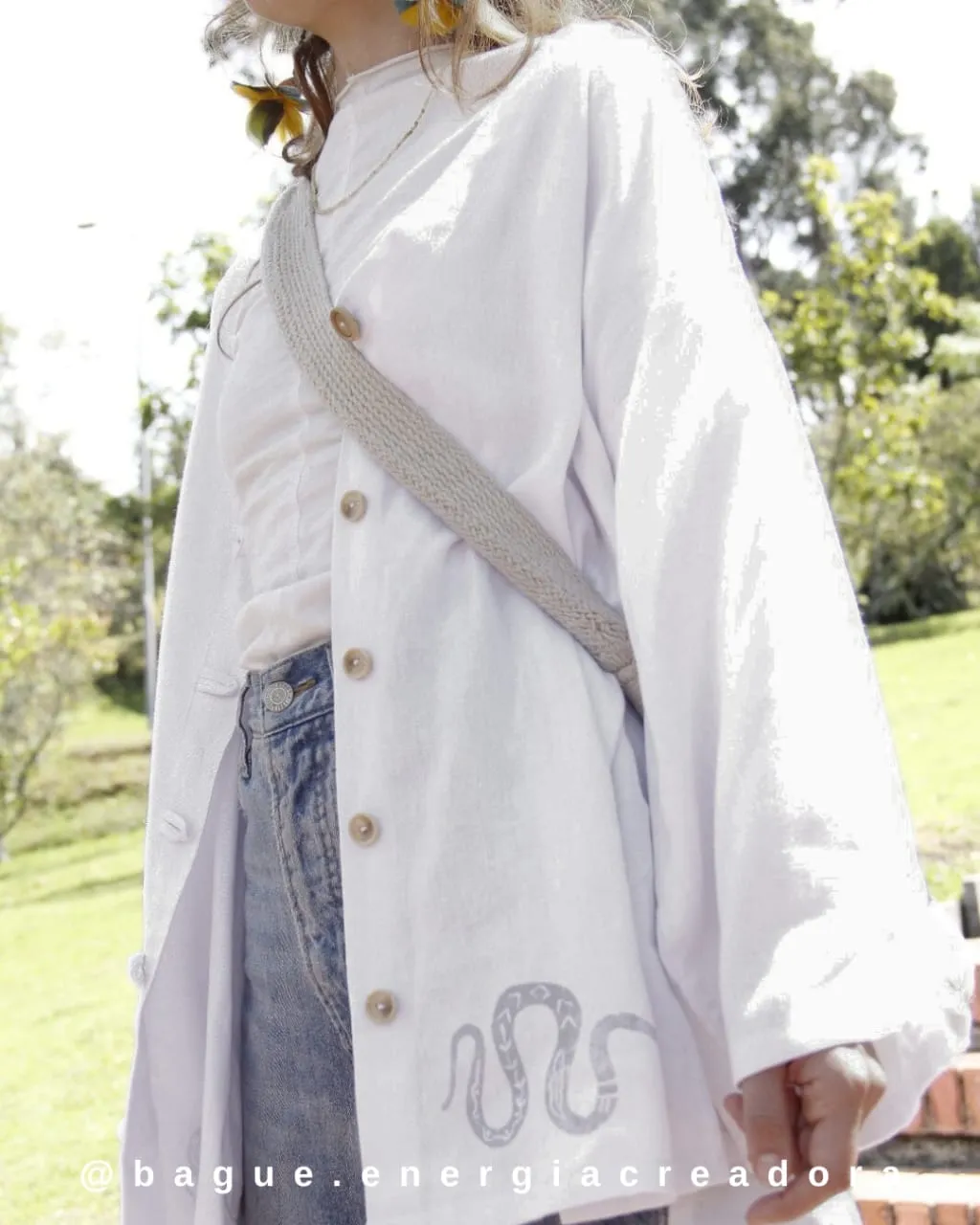 Descubre el Blusón Muyso/Serpiente, una pieza cómoda y significativa con la poderosa simbología de la Serpiente, maestra de la transformación, el cambio de piel y la renovación. Evoca la muerte como un tránsito hacia la vida.