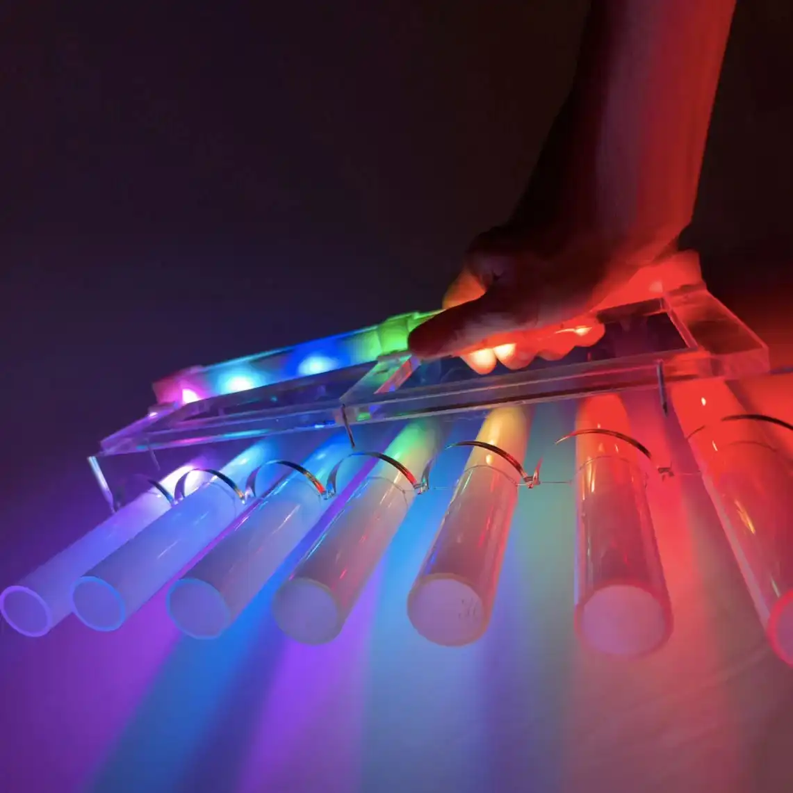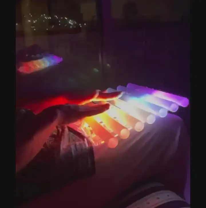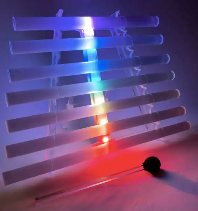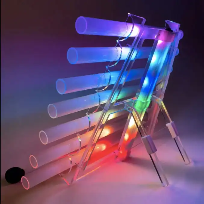 La Arpa de Cuarzo está diseñada con siete piezas de cuarzo blanco montadas en una elegante estructura de acrílico cristalino. Gracias a su sistema cromático con baterías recargables, irradia una suave luz RGB (como se aprecia en la imagen), creando una atmósfera visualmente armoniosa durante su uso.