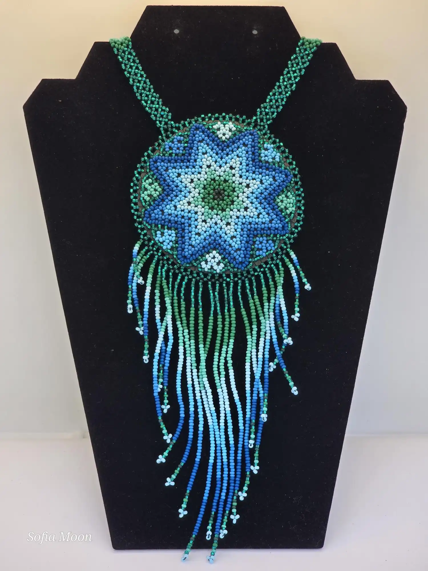 Sumérgete en la elegancia de la naturaleza con este fascinante conjunto de collar y aretes artesanales. Meticulosamente tejido a mano con la técnica de chaquira (mostacillas), su diseño evoca la unión del cielo, el mar y la tierra.