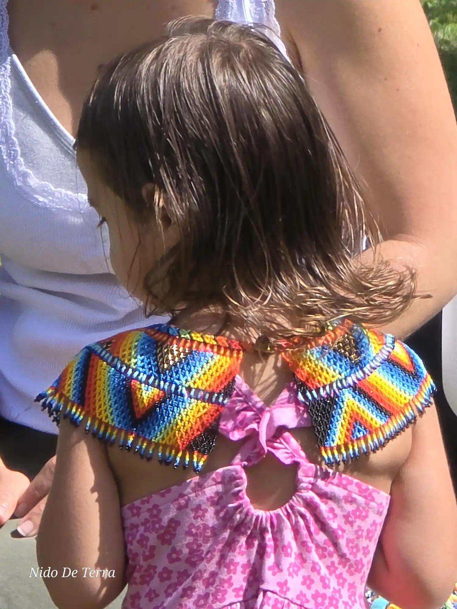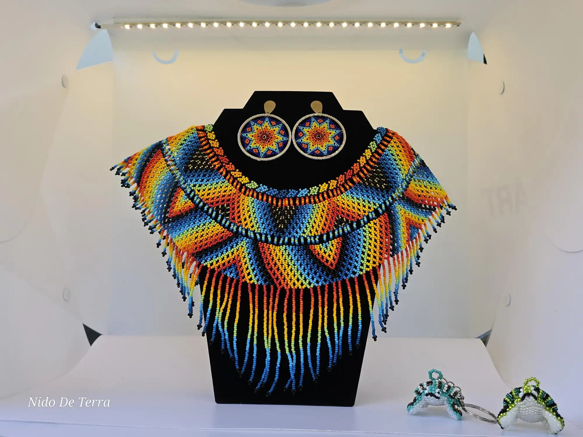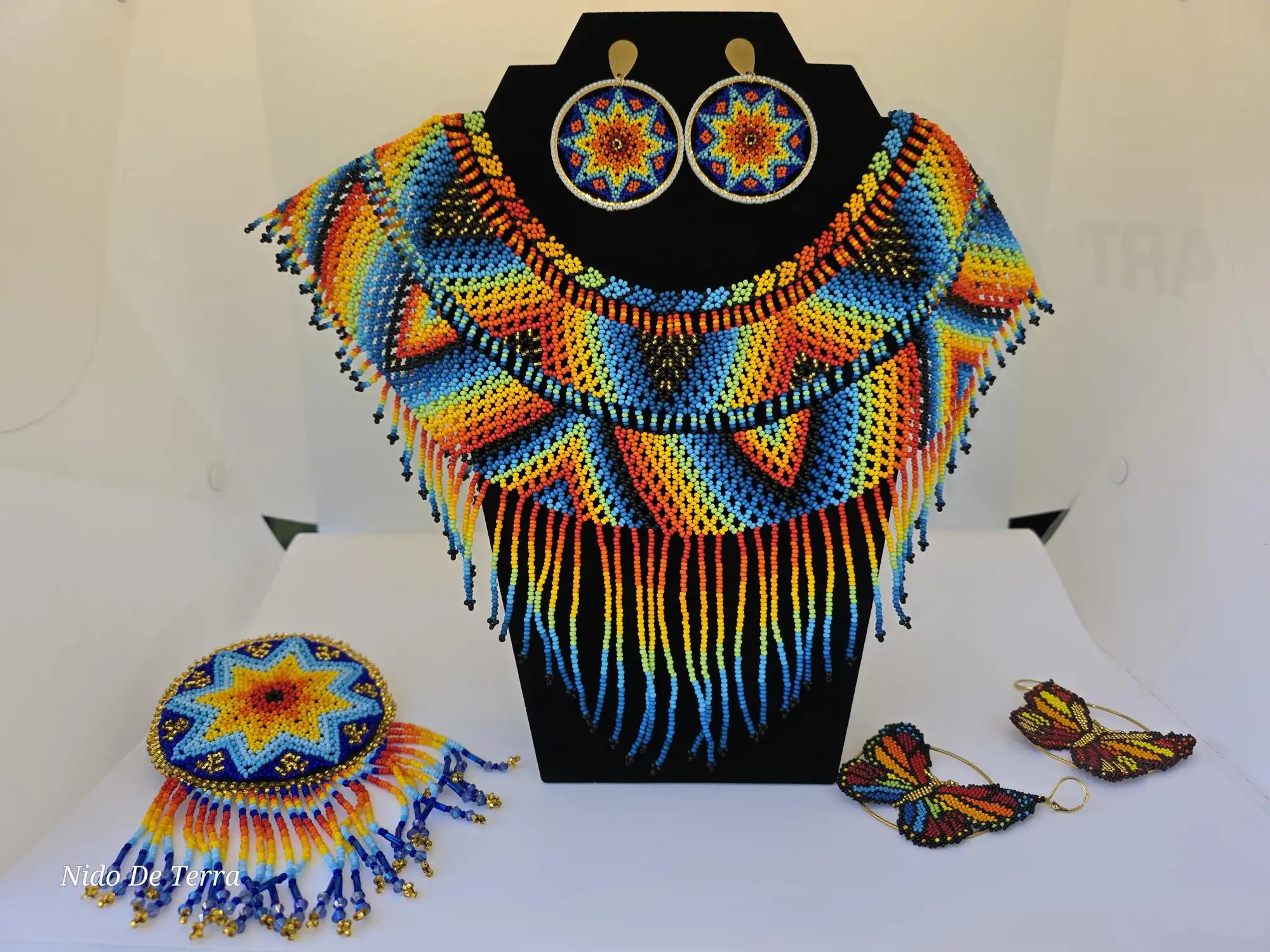 Deslumbra con este espectacular conjunto artesanal de collar y aretes tejidos a mano con la técnica de chaquira (mostacillas). El collar, tipo pechera o babero, es una explosión de color que fusiona tonos intensos como el rojo, naranja, amarillo, azul y negro, creando un impactante diseño geométrico de soles y estrellas.