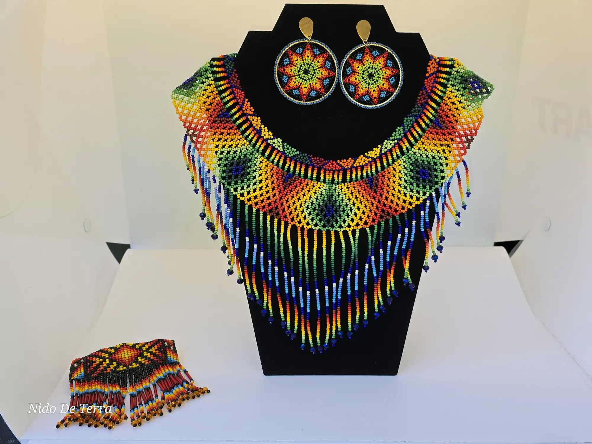 Prepárate para impactar con este deslumbrante conjunto de tres piezas artesanales, meticulosamente tejido a mano con la técnica de chaquira (mostacillas), que irradia color y energía.