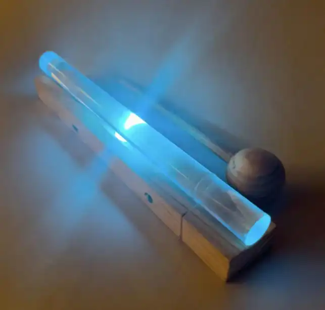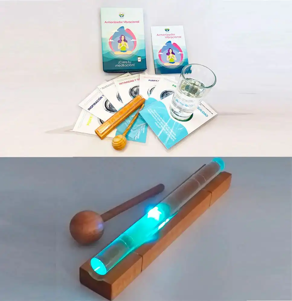 Vibra Rod (Varilla de Cuarzo Cromática): Esta barra de cuarzo cristalino macizo está afinada en la nota Si. Incluye un sistema cromático LED (visible en la imagen) que proyecta los 7 colores del arcoíris, ideal para alinear chakras e irradiar espacios. Se utiliza con el mazo de madera incluido para emitir una vibración sonora pura.