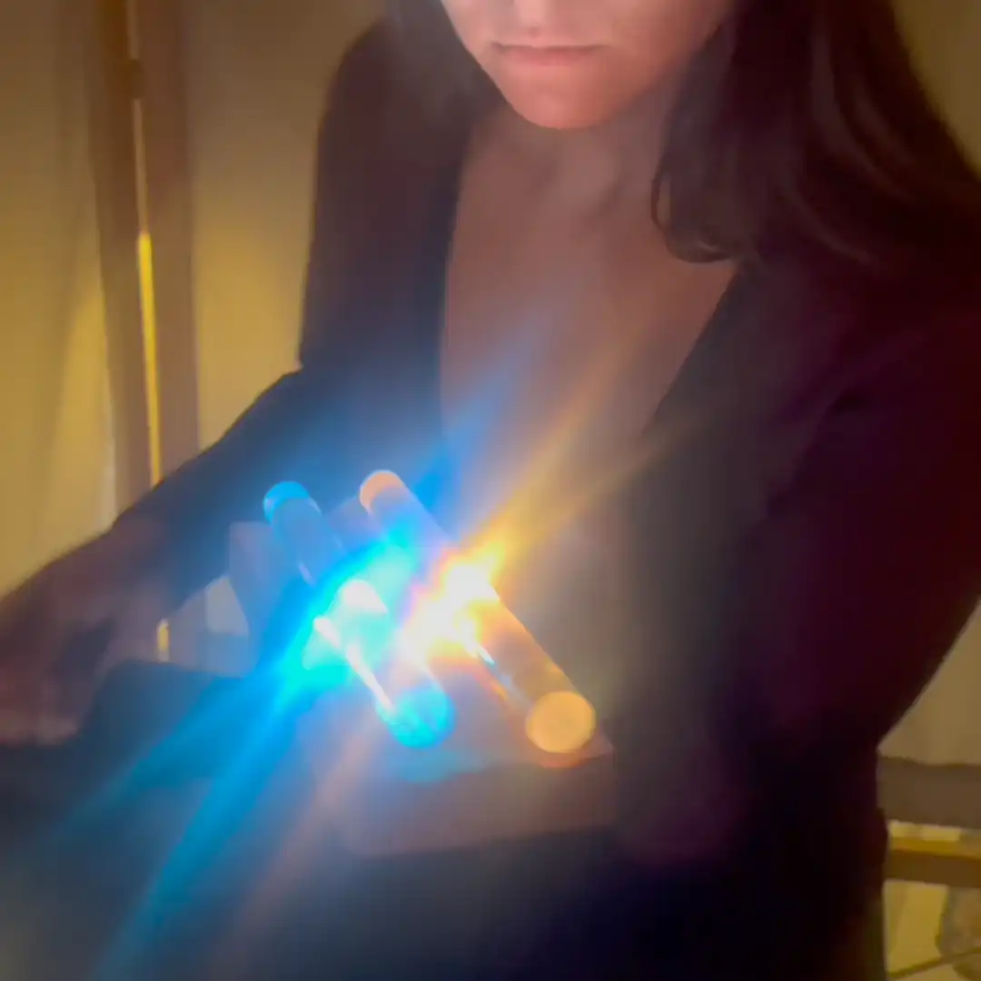 Cada barra de cuarzo translúcido incorpora un sistema cromático independiente, permitiéndote elegir el color que proyecta cada una (como se aprecia en las imágenes). Esto te da la libertad total de combinar los colores que más te inspiren, enriqueciendo tu terapia de sonido con la potente influencia de la luz y la intención. Utiliza este dúo para equilibrar los hemisferios, armonizar los sistemas duales o simplemente para una meditación sonora profunda e inmersiva.