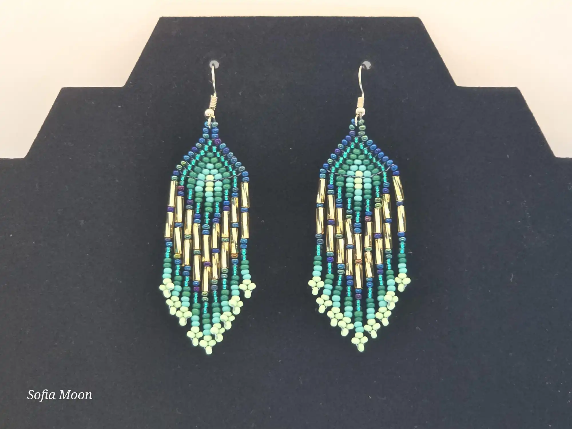 Los aretes colgantes complementan el conjunto con un diseño en abanico de flecos que utiliza los mismos tonos de verde y turquesa. El diseño está enriquecido con cuentas tubulares doradas que añaden un toque de lujo y brillo moderno.