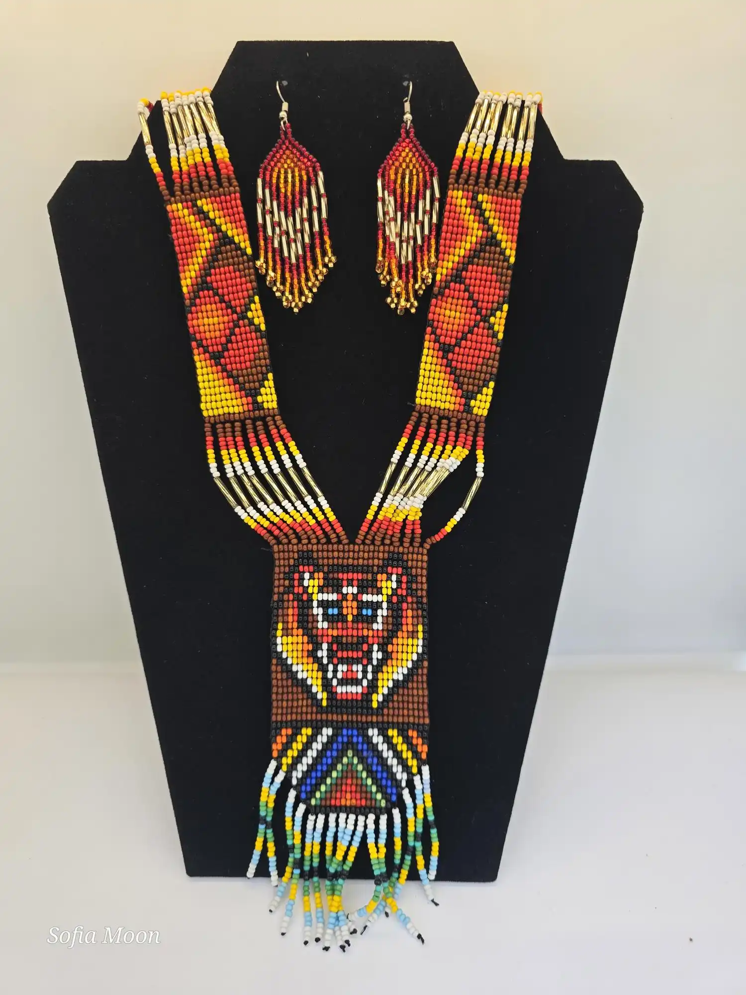 Luce una pieza de poder y significado con este impactante conjunto de collar y aretes artesanales. Meticulosamente tejido a mano con la técnica de chaquira (mostacillas), rinde homenaje a la fuerza de la naturaleza.