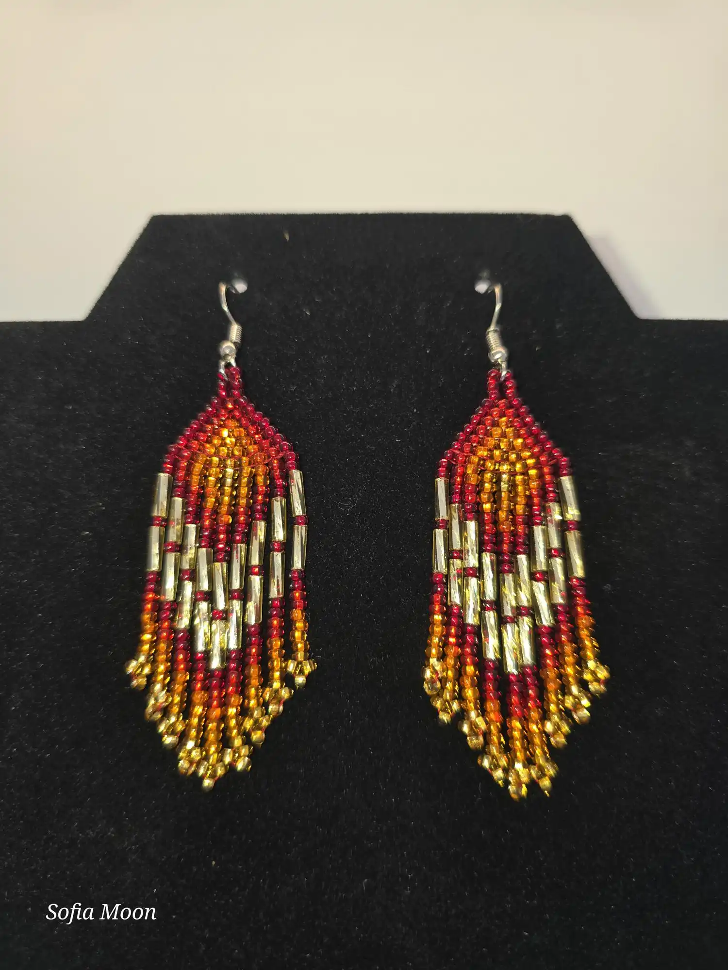 Los aretes colgantes tienen forma de abanico y complementan el collar con un elegante diseño de flecos en tonos de fuego (rojo y amarillo), enriquecidos con cuentas tubulares plateadas y terminados con cuentas doradas, aportando un brillo metálico.
