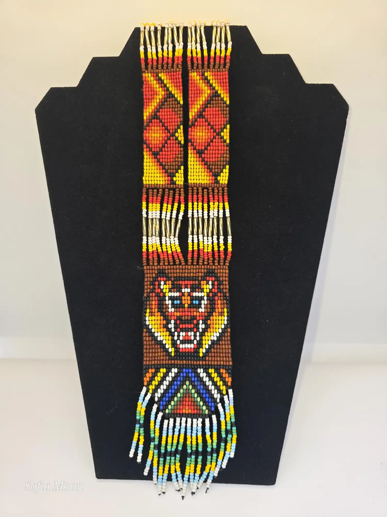 El collar está compuesto por dos bandas anchas tejidas en un vibrante patrón geométrico tribal que combina tonos de rojo, naranja, amarillo y café. Las bandas convergen en un dije rectangular central que presenta el fascinante rostro de un jaguar o tigre en tonos anaranjados y amarillos sobre una base café, con ojos azules penetrantes. La parte inferior remata con un fleco multicolor que añade dinamismo.