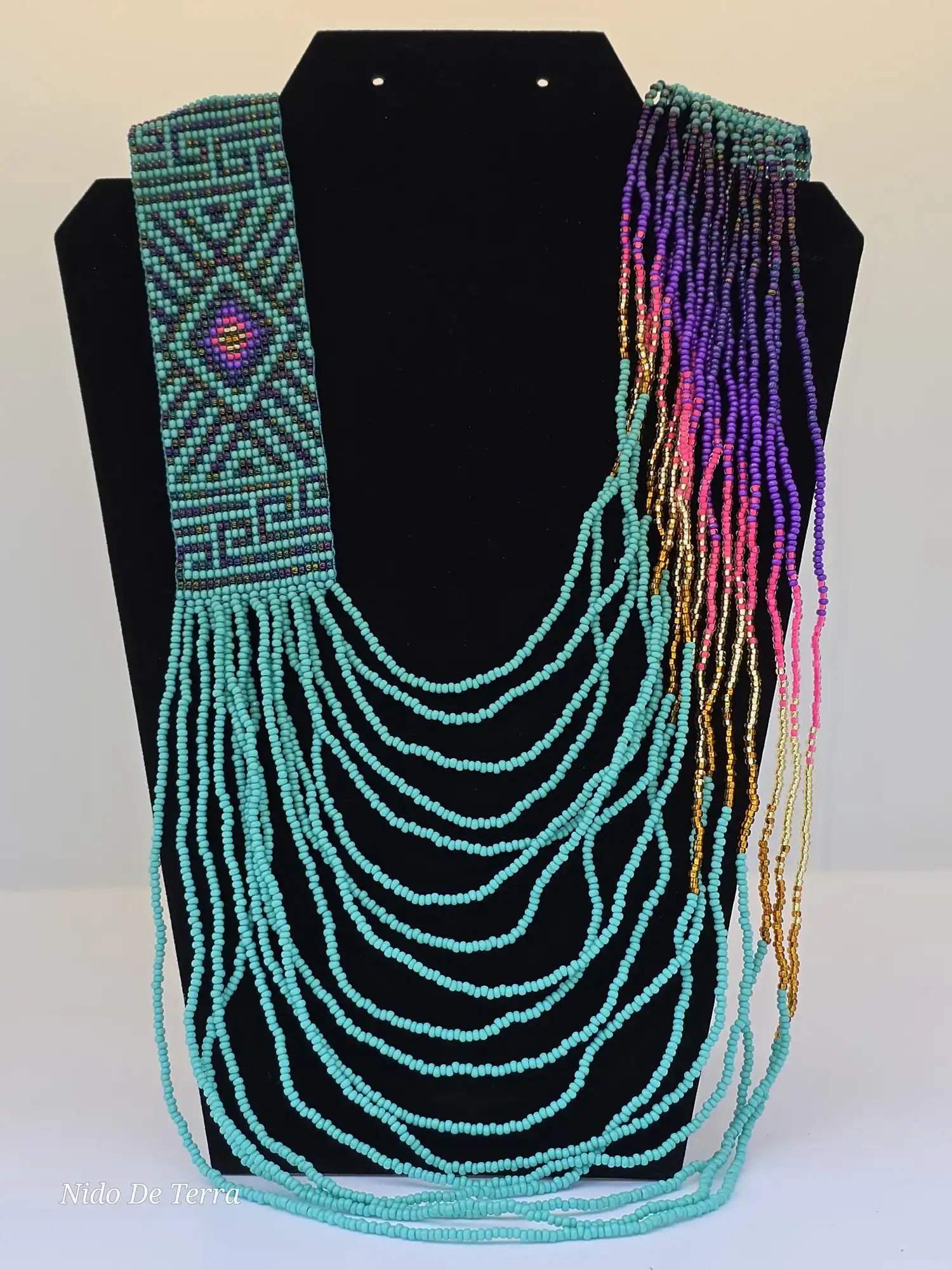 La parte superior del collar es una banda ancha tejida en un patrón geométrico tribal, dominado por el turquesa profundo y el negro, con un rombo central de color fucsia y morado. Esta banda se une a una impresionante cascada de múltiples hilos de chaquira en color turquesa intenso. El otro lado del collar presenta una mezcla de hilos en morado, fucsia y dorado, creando un efecto asimétrico y dinámico.