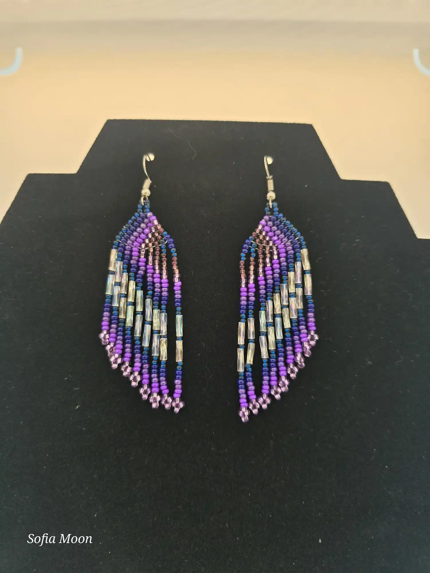 Los aretes colgantes complementan el conjunto con un diseño en abanico que utiliza un degradado de morado y fucsia, incorporando cuentas tubulares plateadas que añaden brillo y un toque moderno.