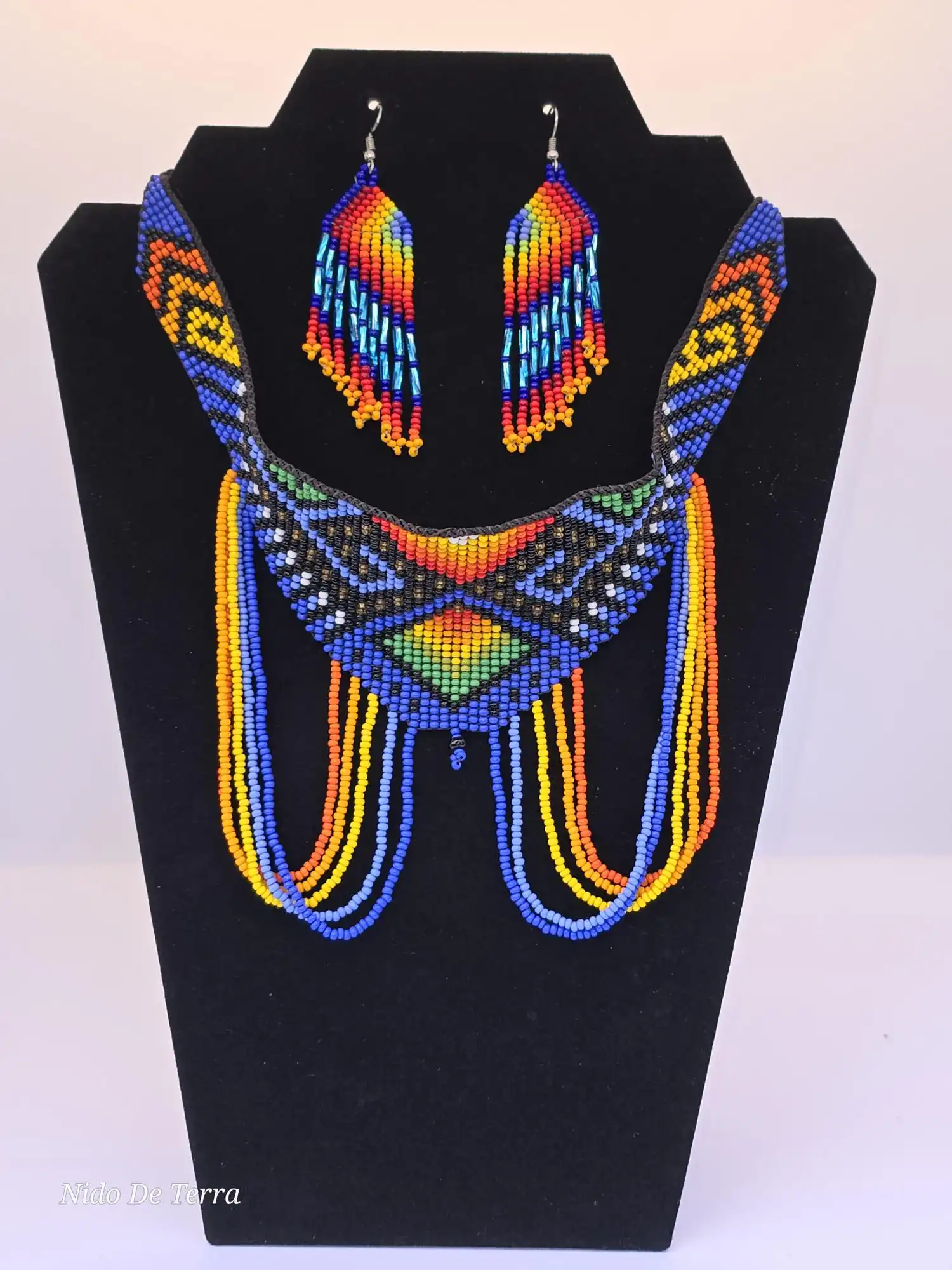 Impacta con este espectacular conjunto de collar y aretes artesanales, una pieza de arte textil tejida a mano con la técnica de chaquira (mostacillas) que desborda color y energía.