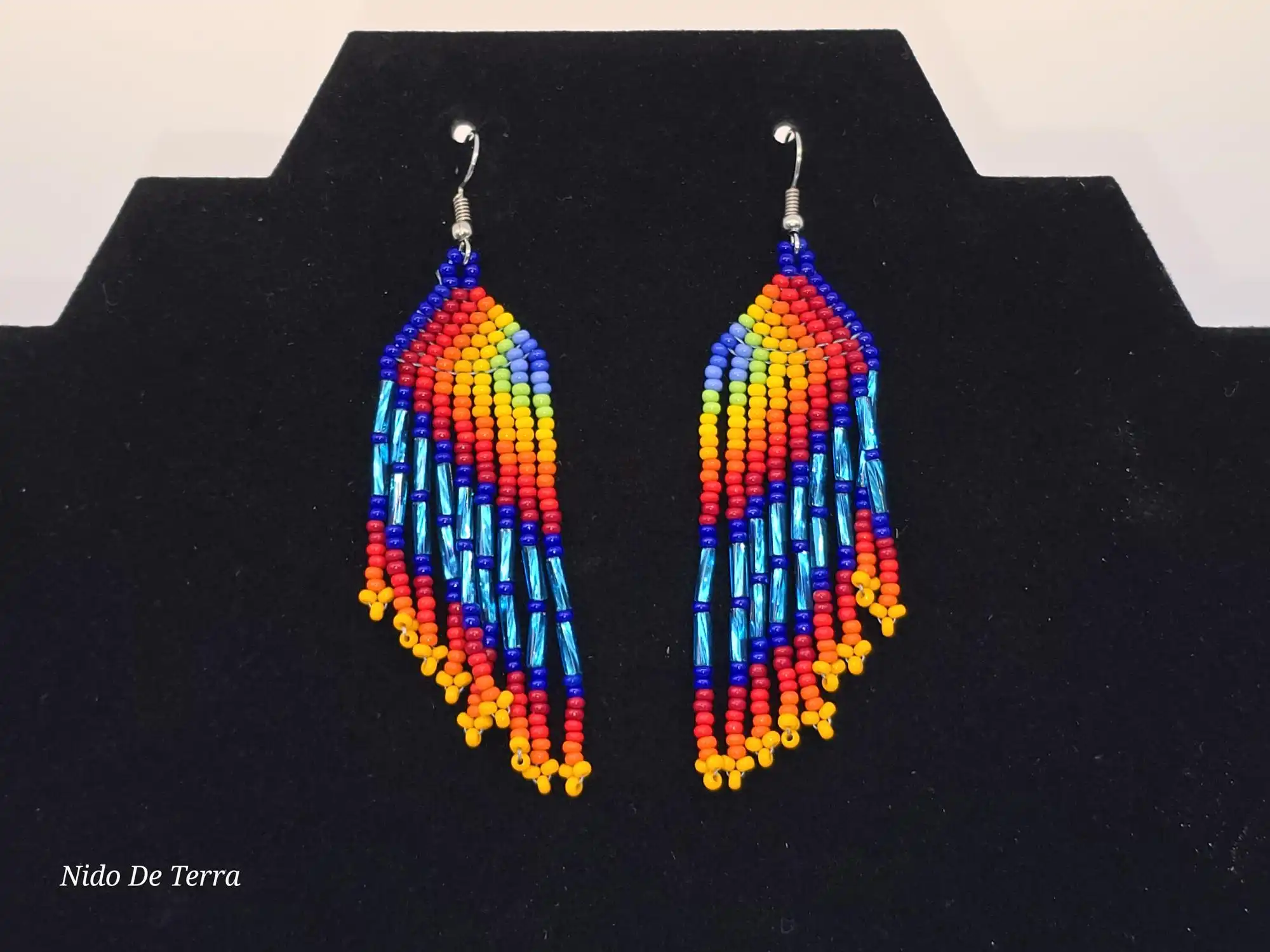 Los aretes colgantes complementan el set con un diseño en abanico que utiliza un degradado de arcoíris y añade cuentas tubulares de color azul metálico que aportan un brillo y una textura moderna.
