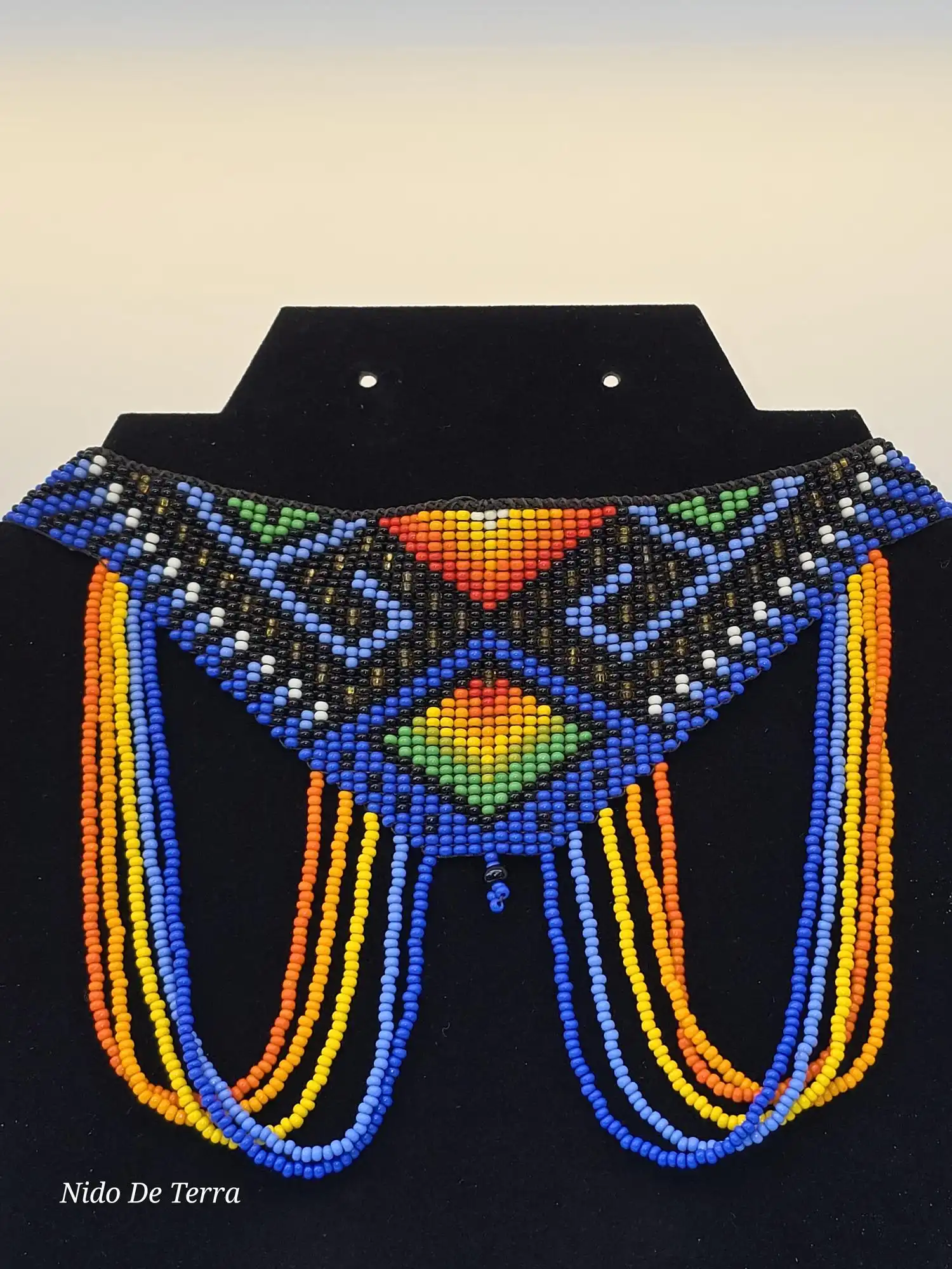 El collar tipo babero (pechera) presenta un diseño semicircular con un patrón geométrico tribal donde dominan los tonos azul, negro, rojo y amarillo. El centro del dije destaca con un rombo en degradado que simula un amanecer.