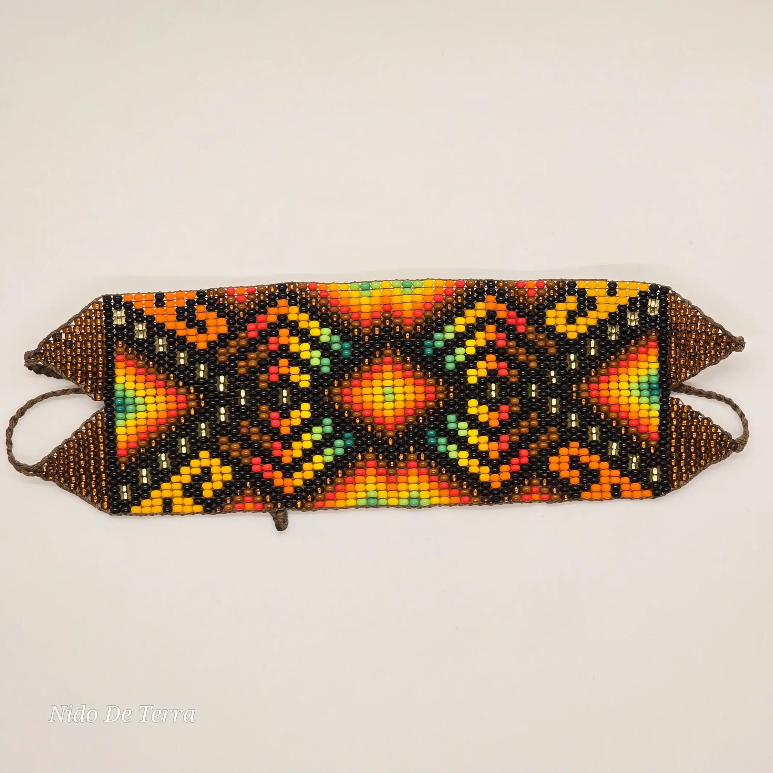 • Acabados Terrosos: Los bordes del brazalete están rematados con chaquiras de color marrón o bronce, y cuenta con un cierre de cordón para un ajuste seguro y flexible.