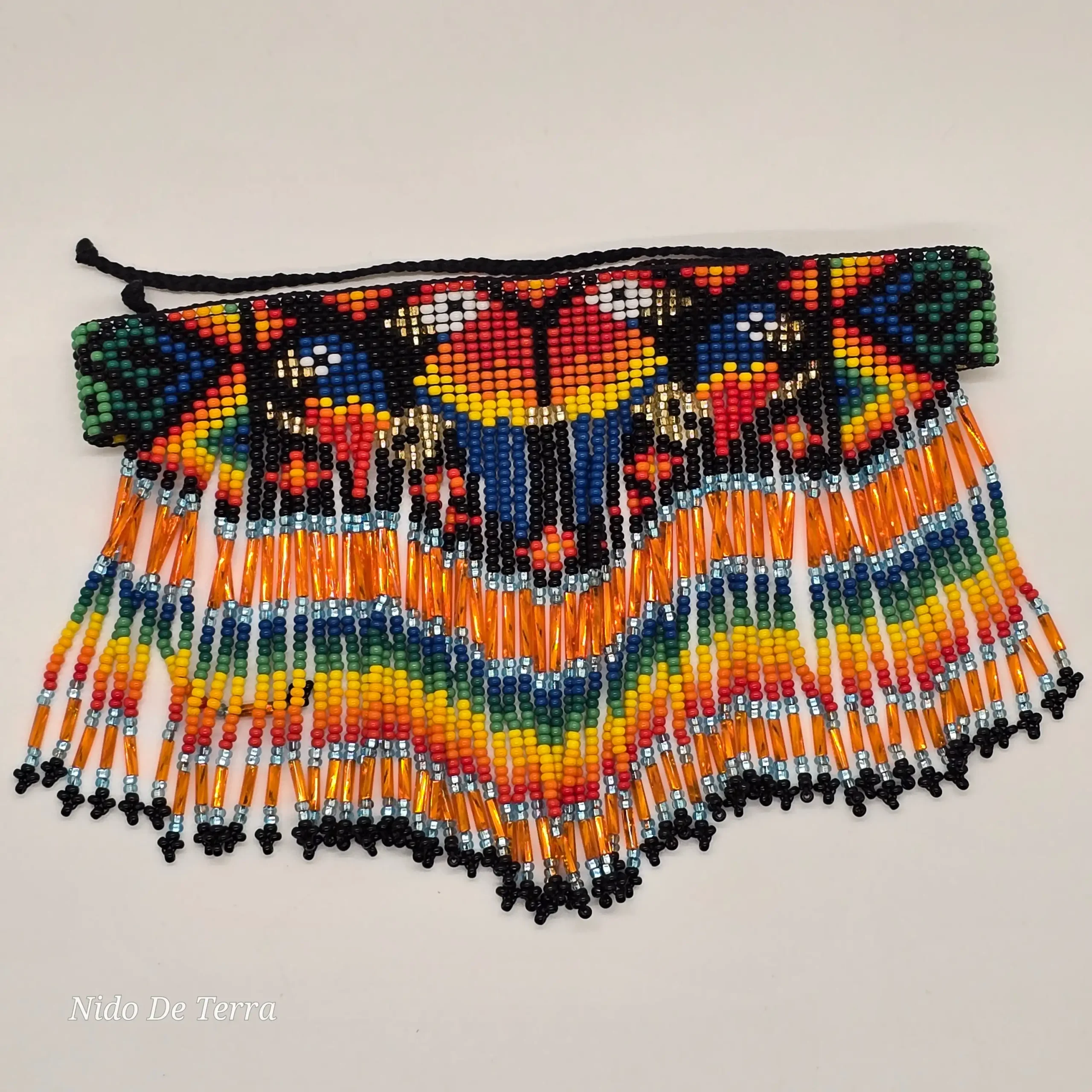 Adopta una pieza de arte poderosa con esta impactante gargantilla (choker) tejida a mano. El cuerpo principal está intrincadamente elaborado con chaquiras, presentando un diseño geométrico que evoca la forma de una máscara, un búho o un rostro felino, cargado de simbolismo y color.