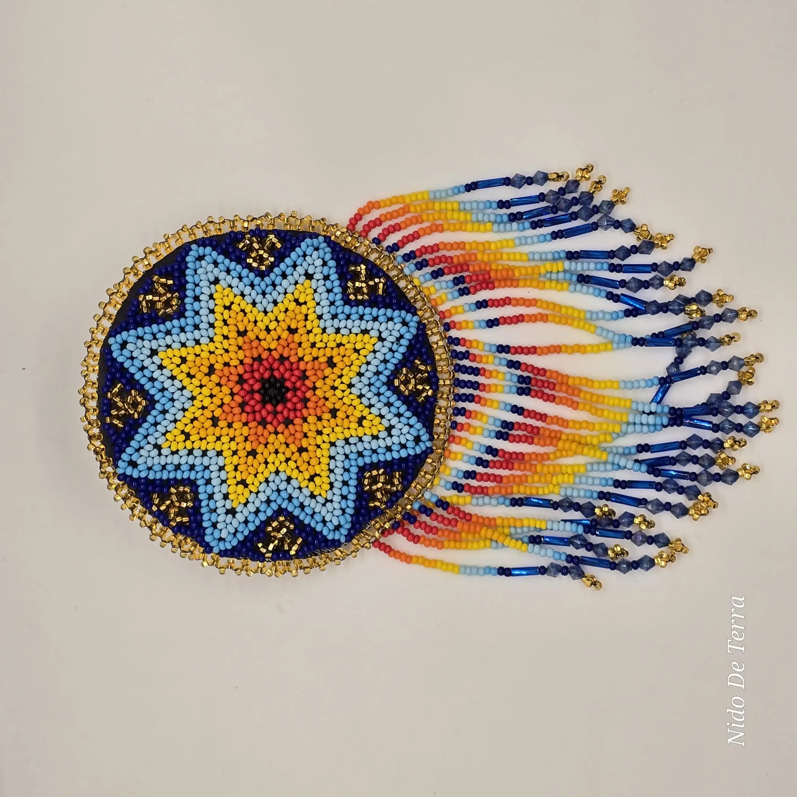Ilumina tu estilo con este vibrante accesorio de chaquiras, tejido a mano con una explosión de color. Su diseño circular central presenta una estrella o sol radiante, que fusiona la calidez del amarillo, naranja y rojo con la profundidad del azul índigo, creando un contraste visual impactante.