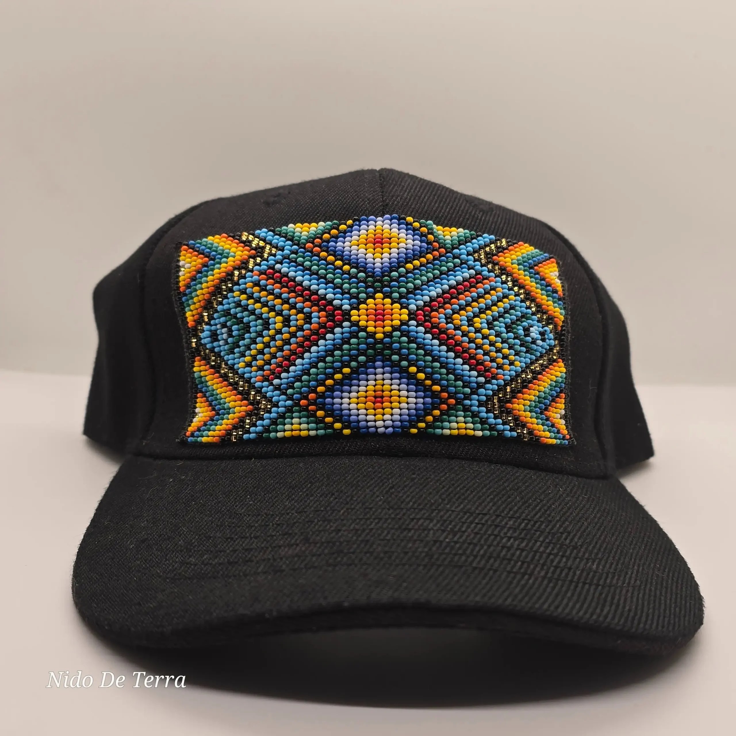 Base de Alto Contraste: El tejido de chaquiras de colores brillantes y detalladas contrasta poderosamente con la tela negra de la gorra, haciendo que el arte resalte con máxima intensidad.