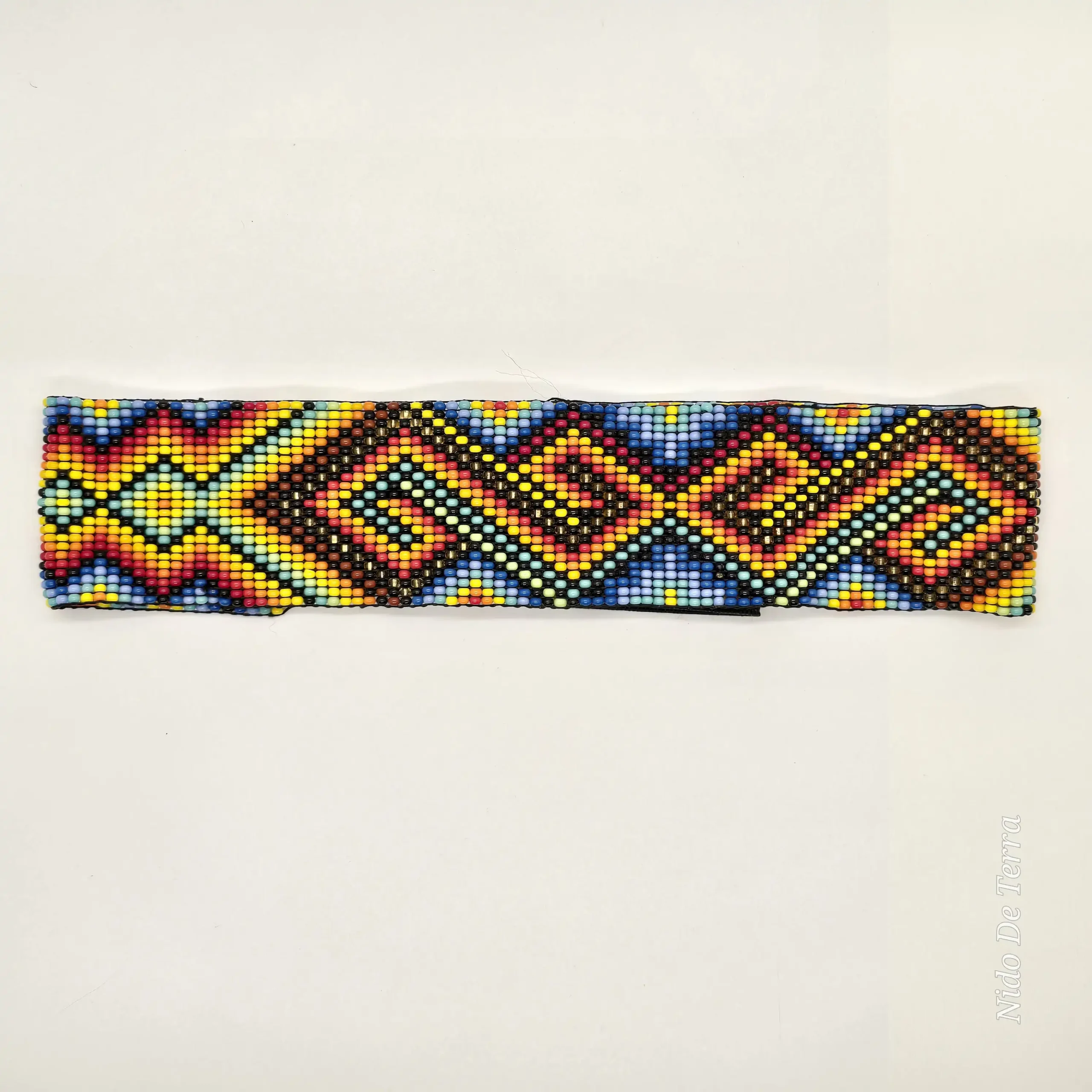 Adopta la complejidad y el color del arte ancestral con esta imponente banda multiuso tejida a mano. Creada meticulosamente con chaquiras finas, el diseño presenta un patrón continuo de grecas o patrones entrelazados con una paleta que irradia energía: amarillo sol, rojo fuego y azul vibrante.