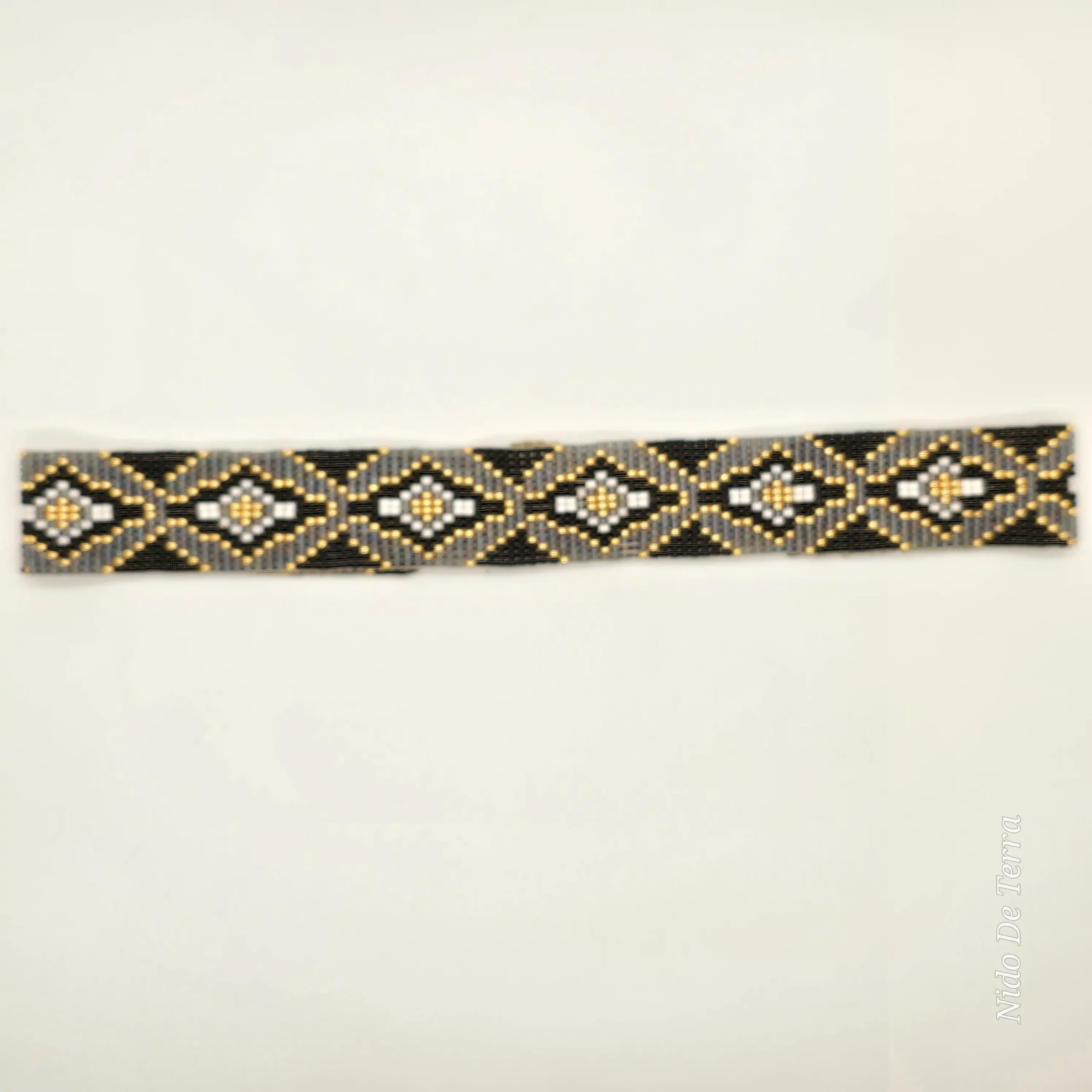 Adopta una sofisticación atemporal y un diseño geométrico con esta impresionante banda multiuso tejida a mano. Creada meticulosamente con chaquiras finas, el diseño presenta un patrón continuo de rombos interconectados que utilizan una paleta neutra y lujosa: gris, negro y blanco, acentuada por pequeños toques de amarillo dorado brillante.