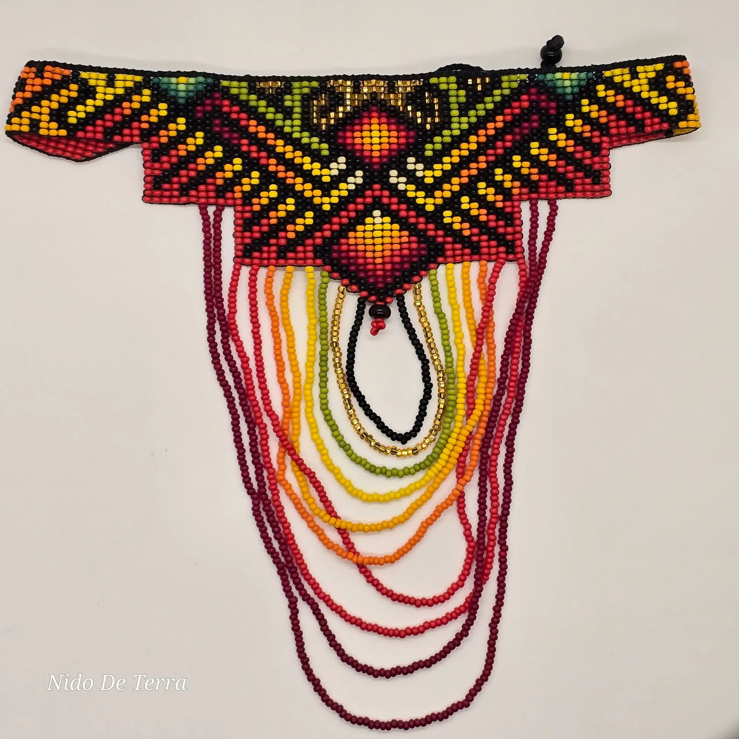 Impón tu estilo con esta espectacular gargantilla (choker) artesanal, una obra de arte que combina la firmeza de la geometría con el fluir del color. La banda principal está tejida a mano con chaquiras en un patrón tribal y simétrico, utilizando una paleta de rojos, naranjas y amarillos que evocan el fuego y el sol.