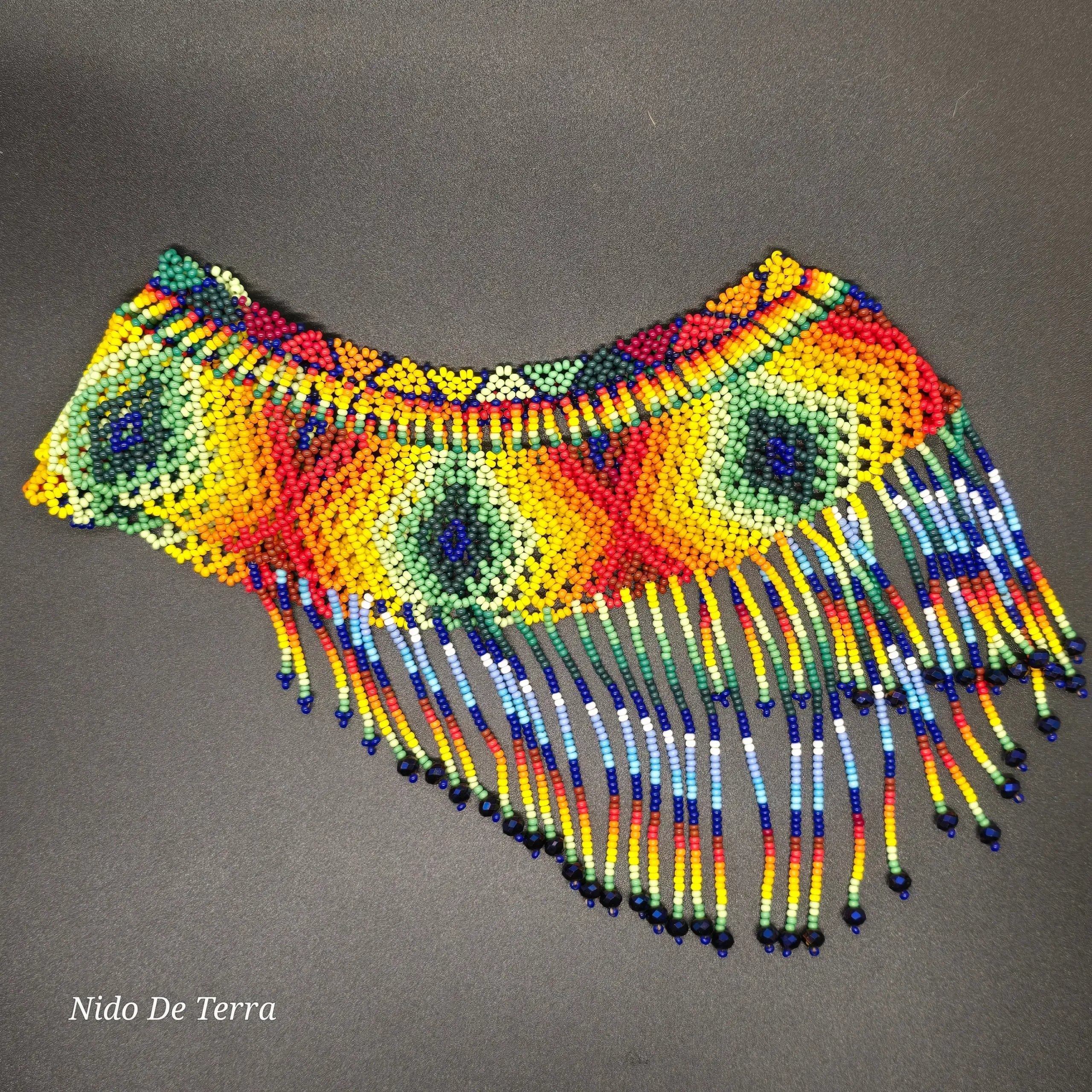 Corazón Tejido del Dije: El centro del dije contiene un patrón concéntrico tejido con chaquiras, creando armonía visual con el collar.