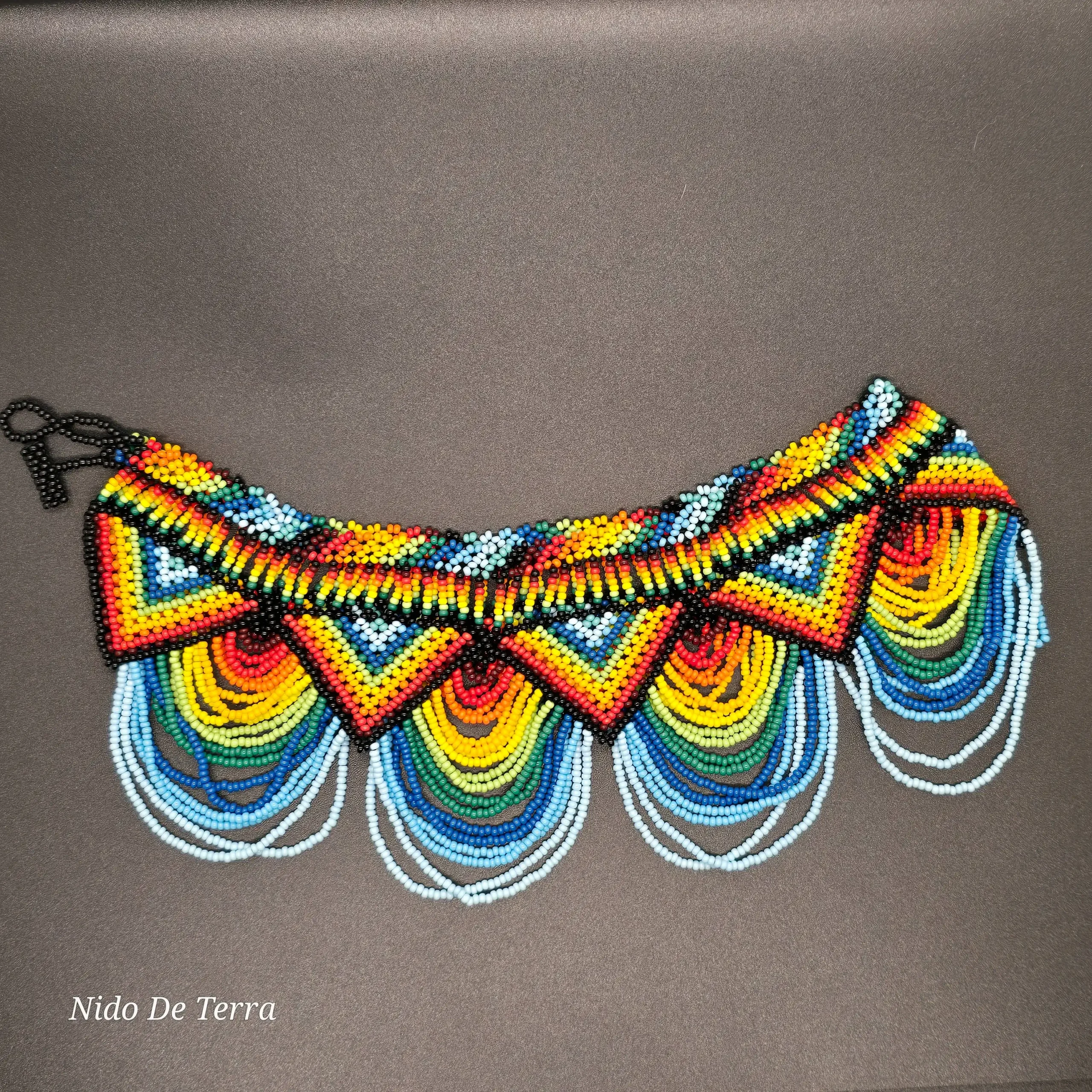 Lleva un símbolo de vida y energía con esta pulsera artesanal de tejido en chaquiras. Creada meticulosamente a mano, el diseño central es una figura de sol o flor con un patrón de cruz, tejida en vibrantes tonos rojos y amarillos. Este sol está flanqueado por potentes rombos que presentan un espectacular degradado de colores, del verde esmeralda al amarillo brillante. La pulsera es un accesorio audaz y significativo, ideal para un estilo boho-chic o como una pieza de arte portátil que celebra la precisión artesanal.