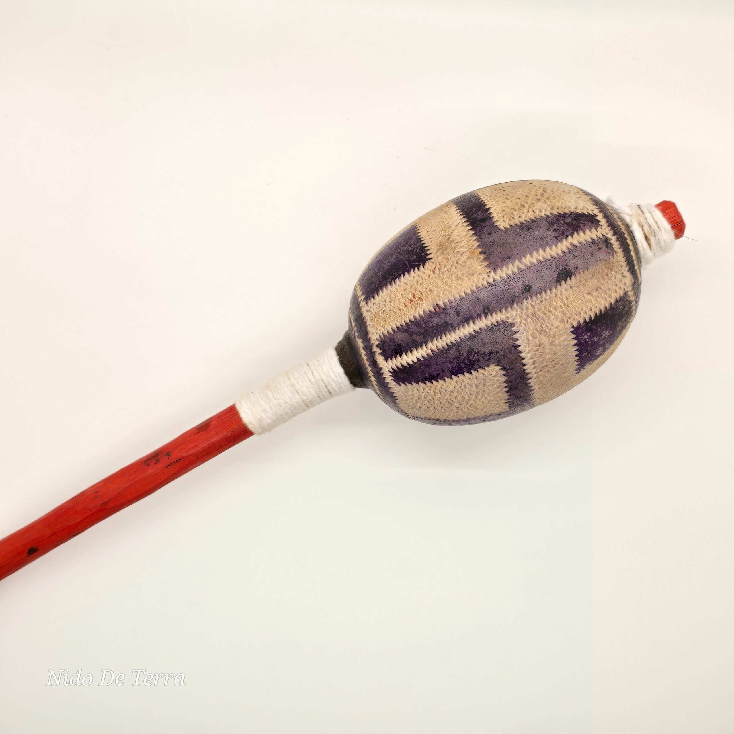 Adopta el ritmo y la tradición ancestral con esta maraca ceremonial artesanal. El cuerpo resonante de la maraca está elaborado a partir de un fruto seco (calabaza) o cuero, con un diseño distintivo de patrón geométrico tribal en un profundo color púrpura y tonos naturales.
