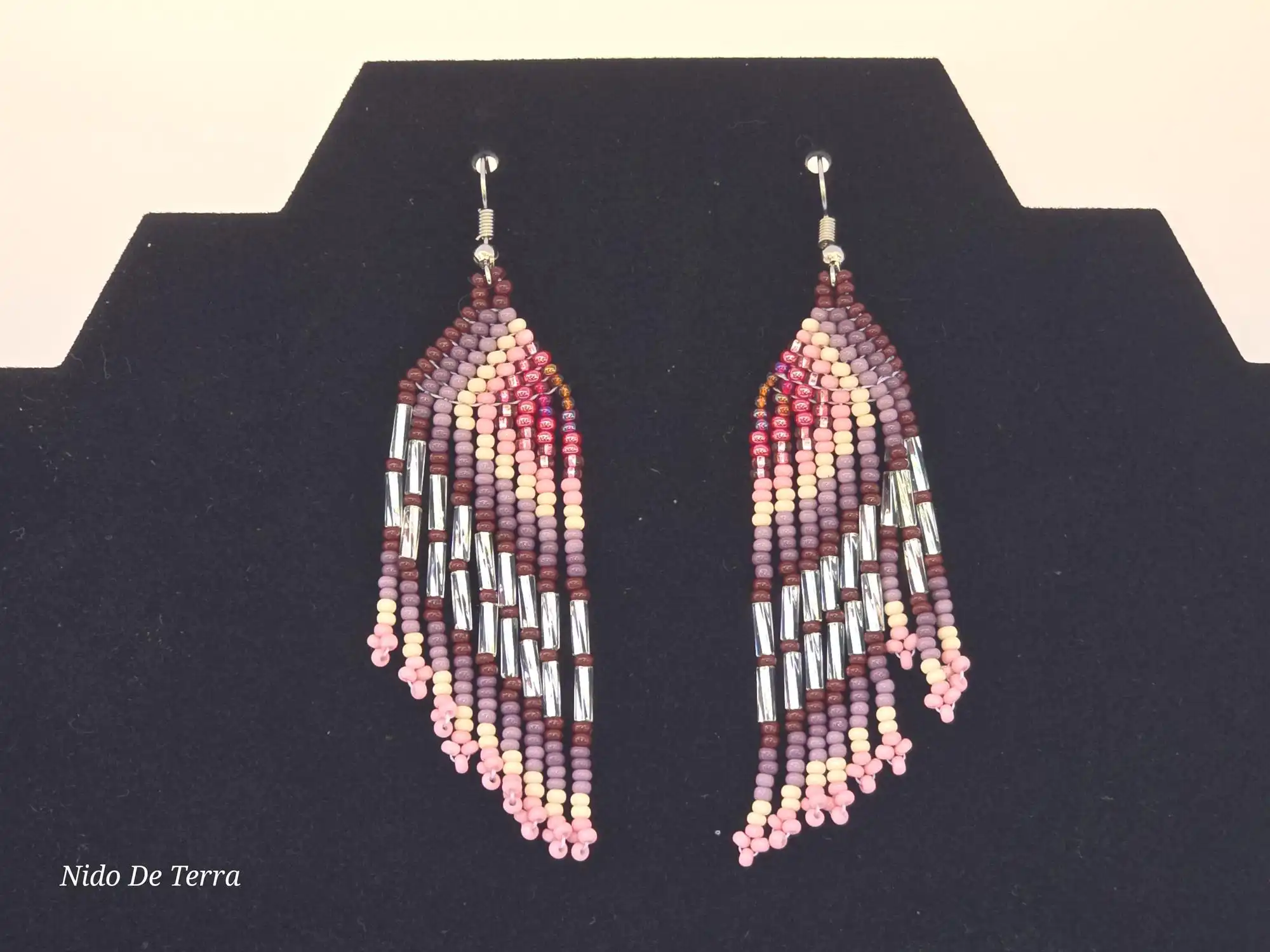 Aretes largos de chaquira, diseño de flecos elegantes con tonos nude, rosa viejo y acentos plateados.