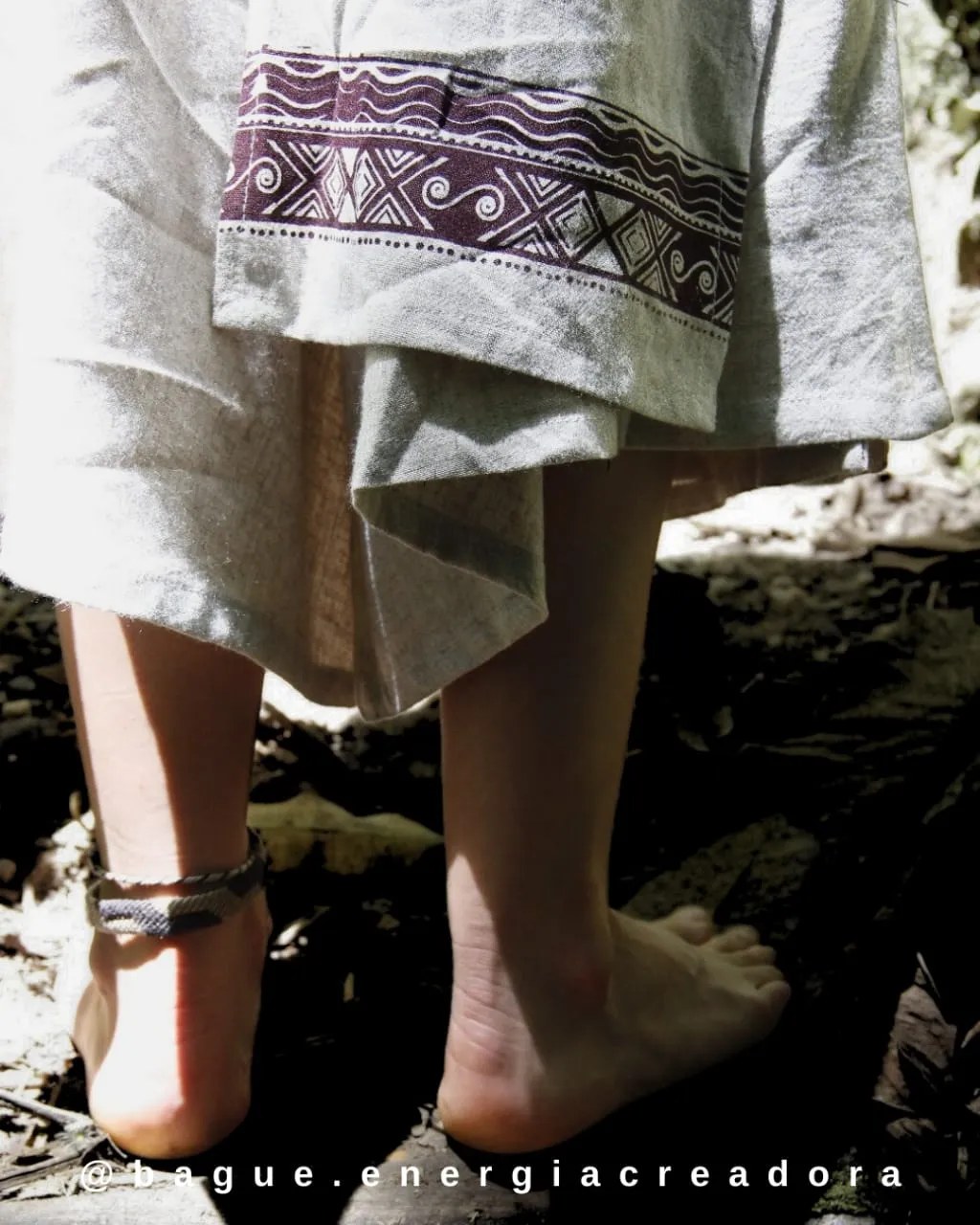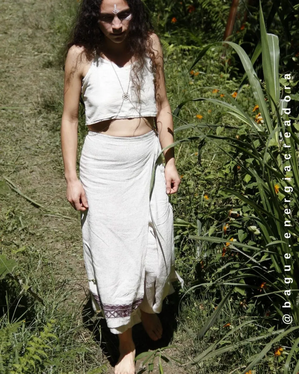 Simbología y Artesanía: Su tejido simbólico evoca la Laguna, el trabajo interior y exterior, la doble espiral, el tejido y la labranza. La estampación es manual con tintas a base de agua y simbología ilustrada por nosotras.