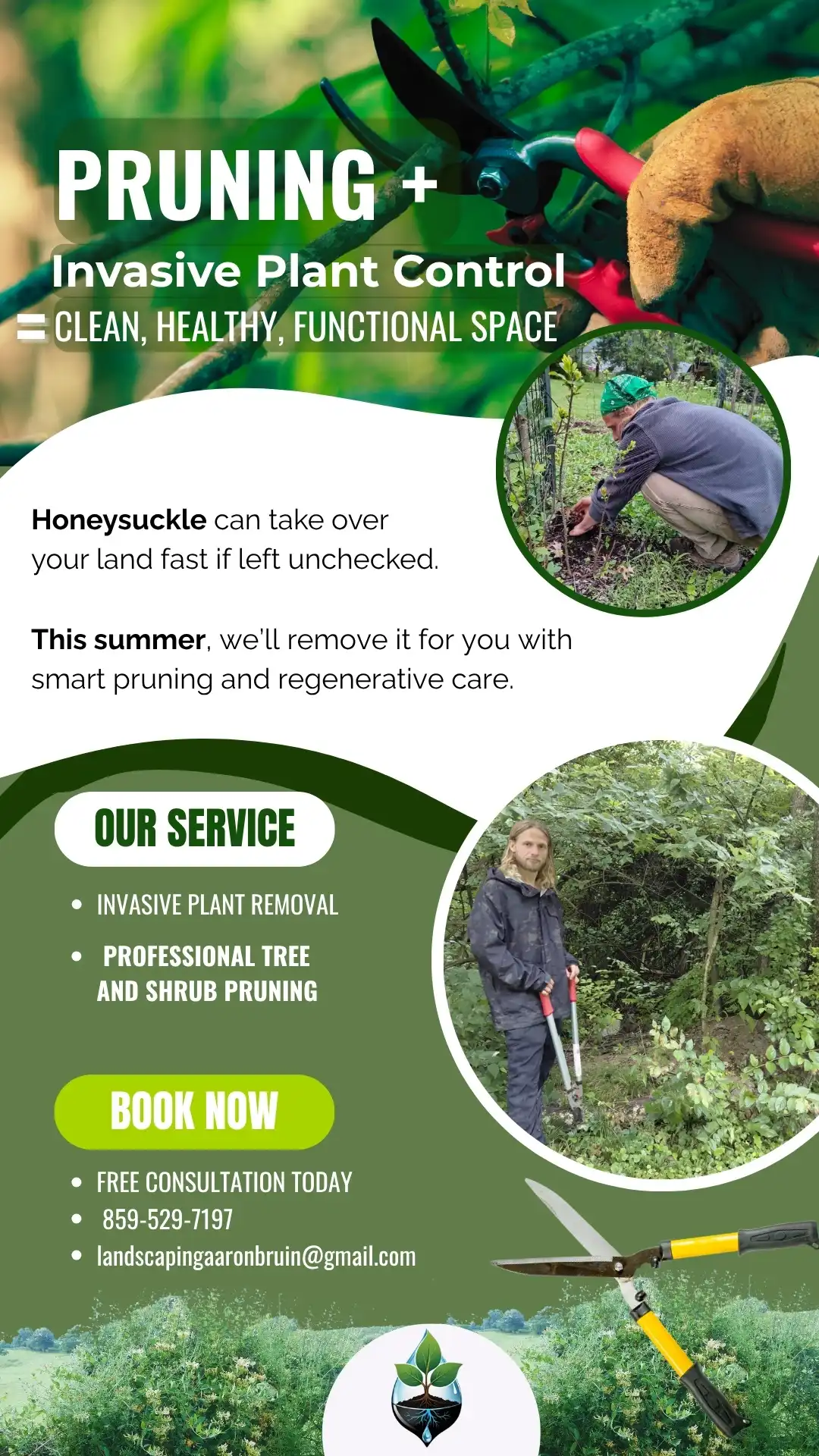 Nuestro servicio de Poda y Control de Plantas Invasoras es la clave para crear un Espacio Limpio, Saludable y Funcional en tu terreno. Plantas como la madreselva (Honeysuckle) pueden apoderarse rápidamente de tu jardín si se dejan sin supervisión. Este verano, te ofrecemos la solución: la eliminaremos mediante una poda inteligente y un cuidado regenerativo que asegura la salud a largo plazo de tu espacio verde. Nuestro servicio incluye la remoción de plantas invasoras y la poda profesional de árboles y arbustos, realizada con la experticia y la intuición de un jardinero que prioriza el equilibrio ecológico. ¡Agenda tu consulta gratuita hoy mismo! Todas nuestras prácticas y el manejo de tu terreno se realizan bajo principios artesanales y conscientes, priorizando la regeneración y el bienestar del ecosistema.