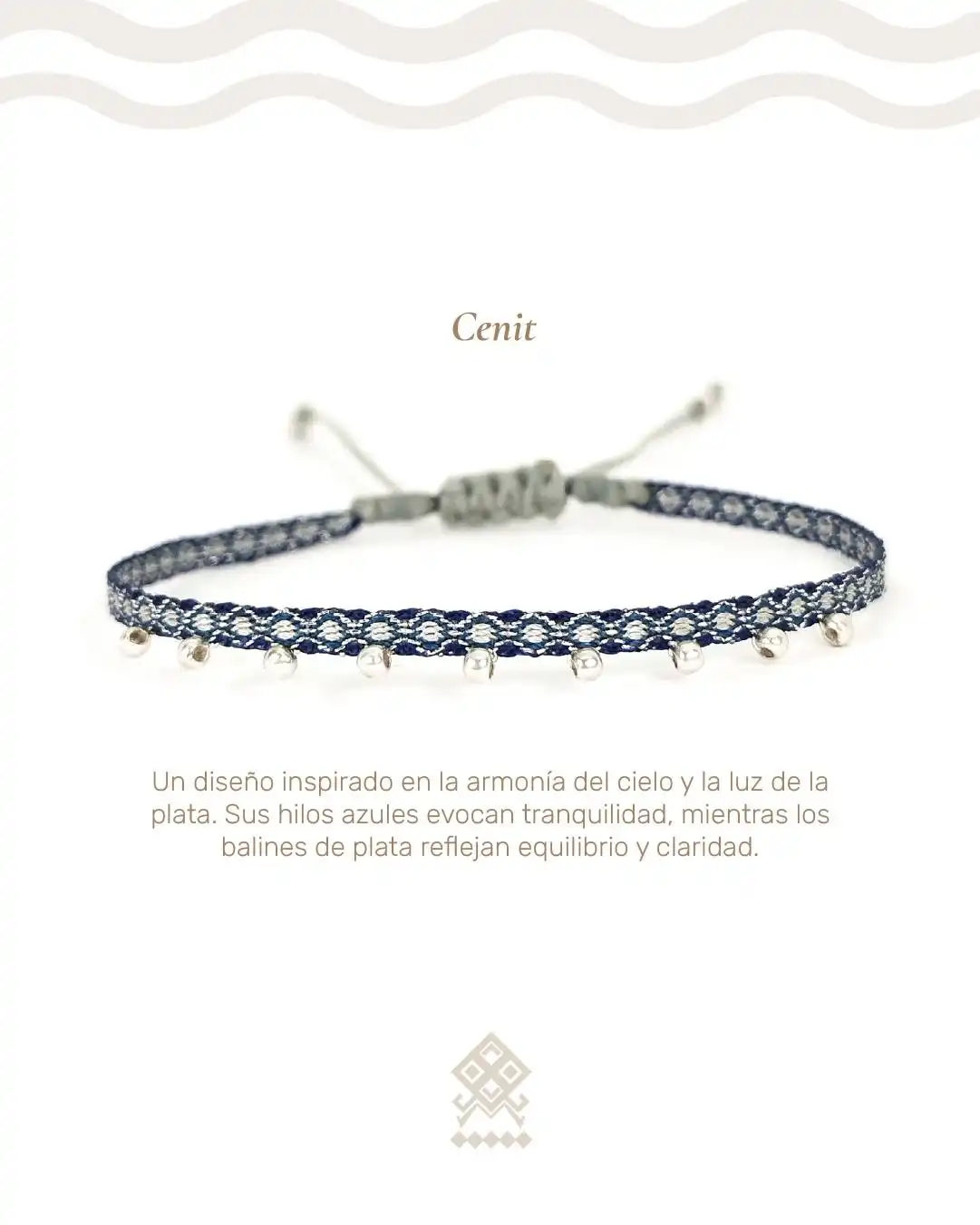Inspirada en la armonía del cielo y la luz, la pulsera artesanal Cenit es una joya sutil tejida a mano con profunda dedicación. Sus hilos en azul marino y blanco/plata presentan un delicado patrón de ondas que evoca tranquilidad y serenidad. El diseño se realza con pequeños balines de plata colgantes, que reflejan equilibrio y claridad. La plata, junto con los tonos azules, crean una estética atemporal y versátil. Su cierre de macramé deslizable en hilo gris garantiza un ajuste cómodo y seguro. Adquiere esta pieza única y lleva contigo la calma, la calidad y el valor inigualable de una creación genuinamente hecha a mano.