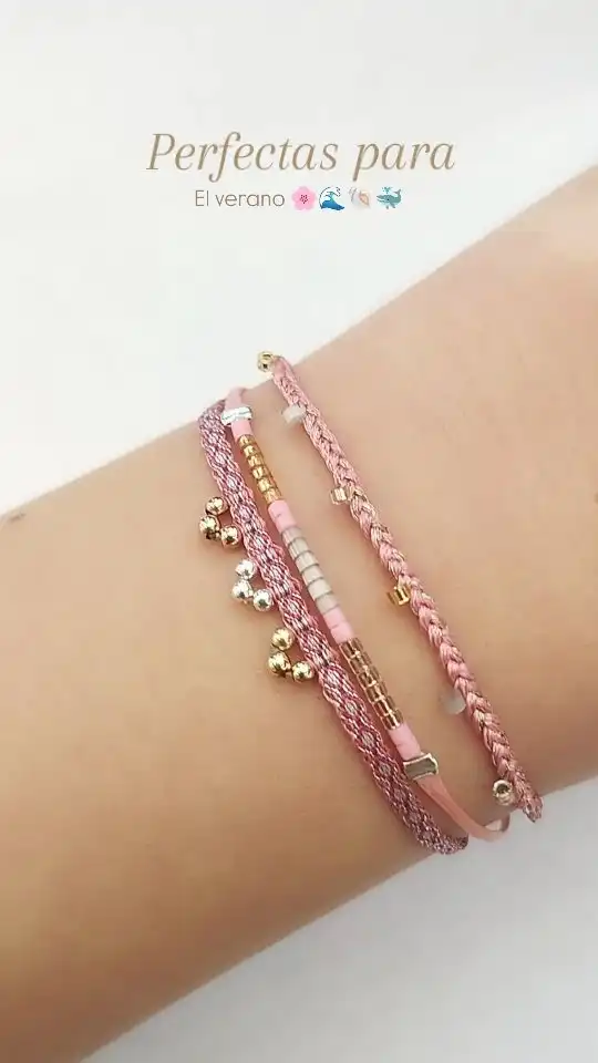 Ilumina tus días de sol con este encantador set de tres pulseras artesanales, tejidas a mano y perfectas para el verano. Cada pulsera en el conjunto ofrece un estilo y una textura diferente, creando un stack (apilado) vibrante y armónico en una paleta de tonos rosa, salmón y coral.