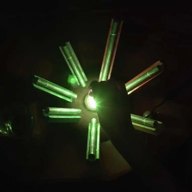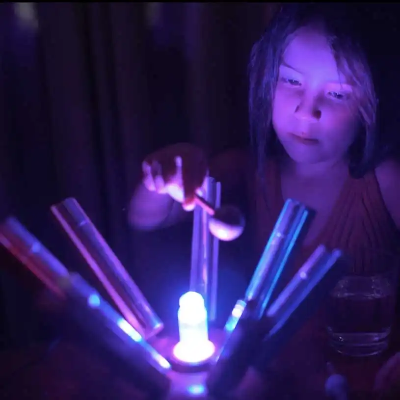La Rainbow Flower consta de 7 barras de cuarzo dispuestas de forma radial, cada una con la vibración de un color del arcoíris. El corazón del instrumento proyecta una luz RGB que irradia simultáneamente los siete colores, creando un ambiente visualmente estimulante (como se aprecia en las imágenes).