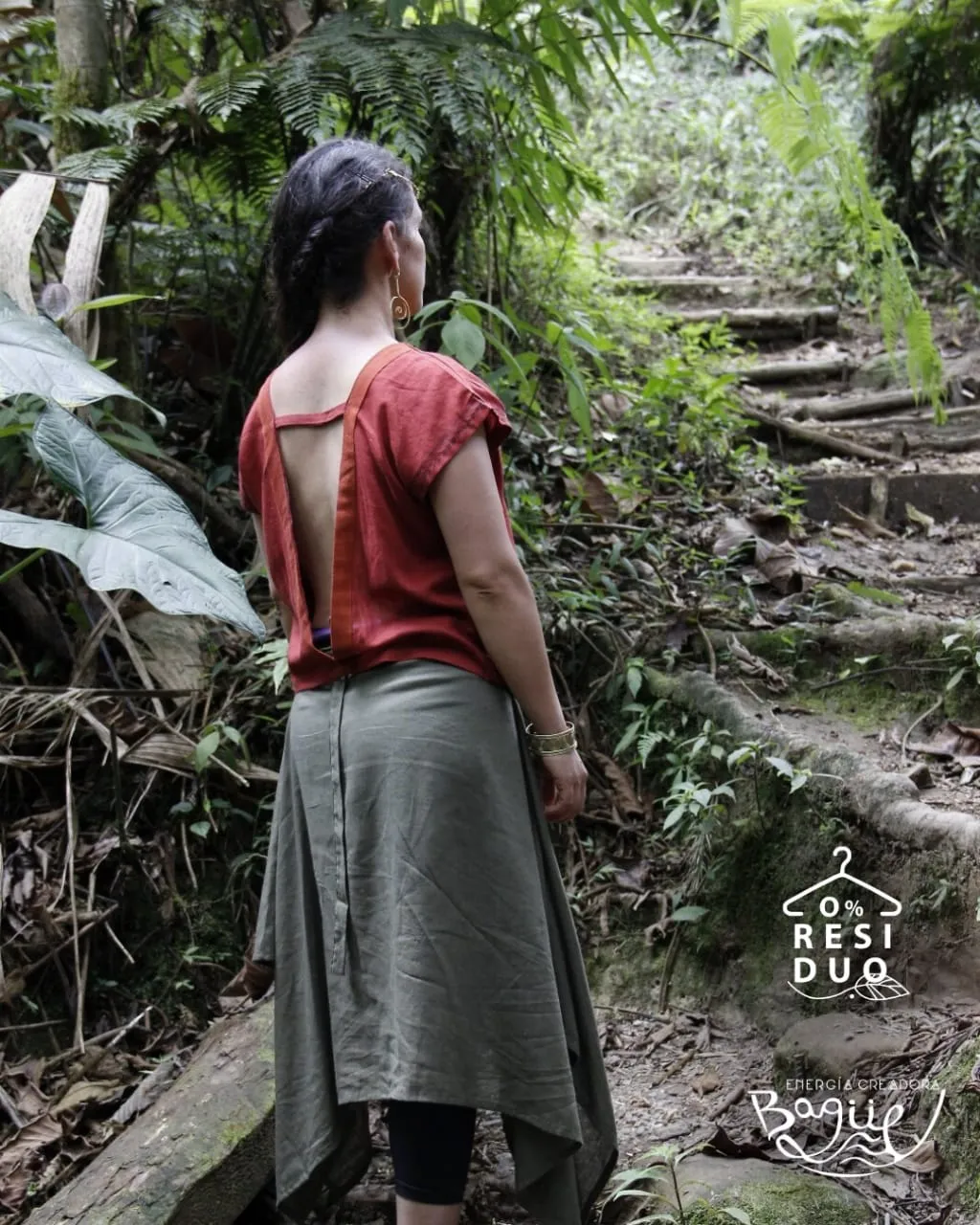 Diseño Consciente: Creada bajo el principio de Cero Residuos (0 RESIDUO), minimizando el desecho textil a un impacto mínimo del 1% en su producción. Está elaborada con fibra 100% natural.