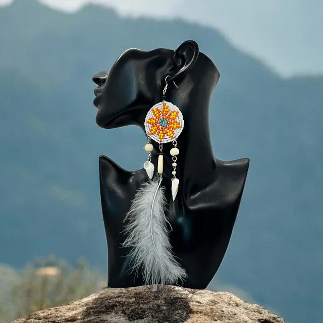 Detalle Amazónico: La pieza culmina con una gran pluma natural blanca y esponjosa, que añade un toque de pureza, movimiento y ligereza al diseño, característico de las plumas de aves de la selva.