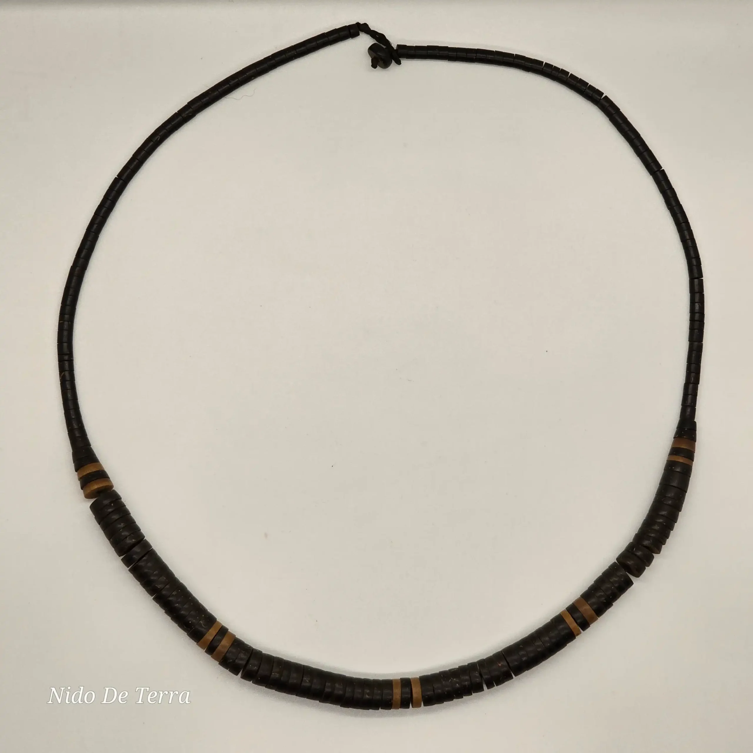 Collar artesanal minimalista de cuentas planas oscuras, acentuado con detalles de madera clara.