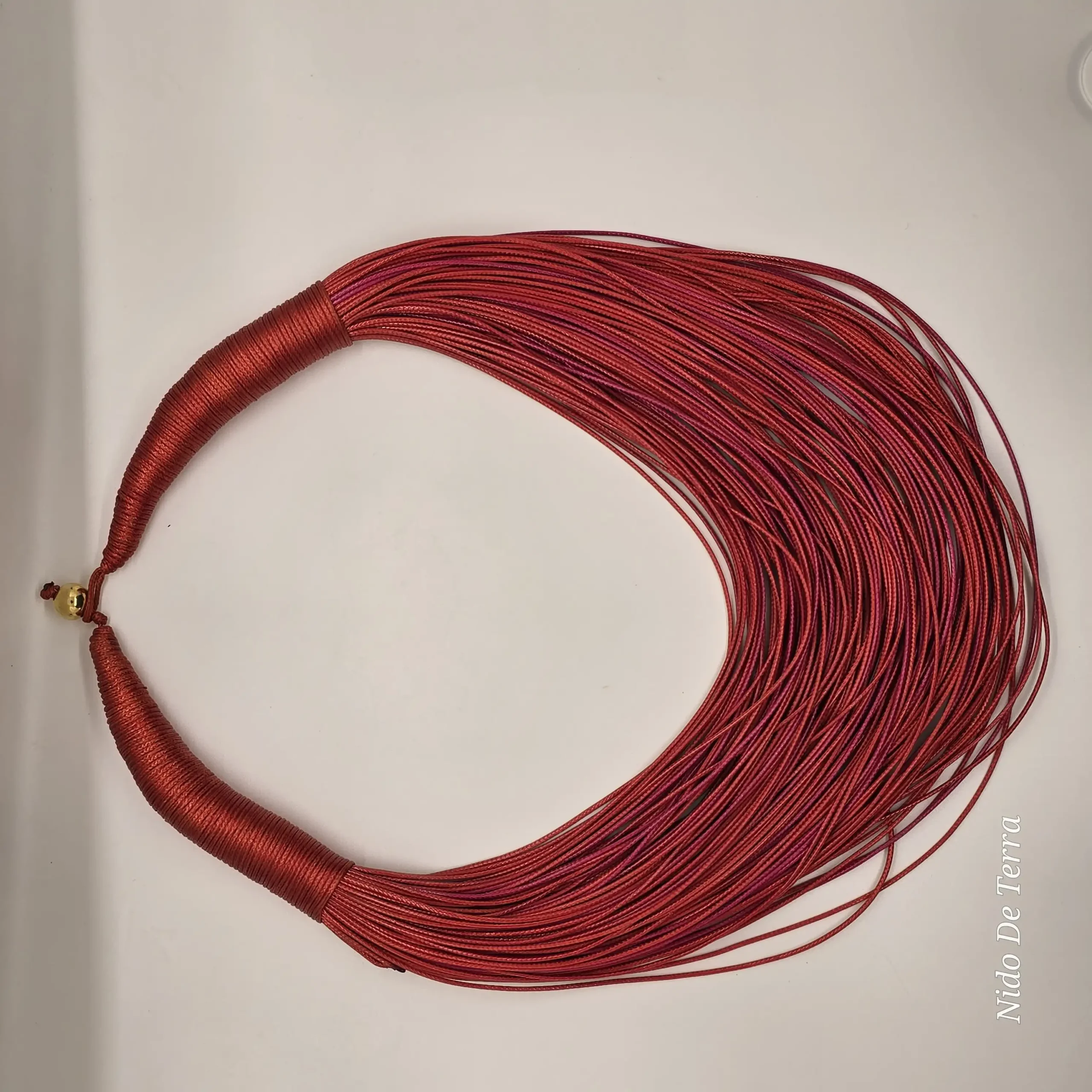 Collar artesanal voluminoso de múltiples hebras de hilo rojo intenso con un diseño moderno.