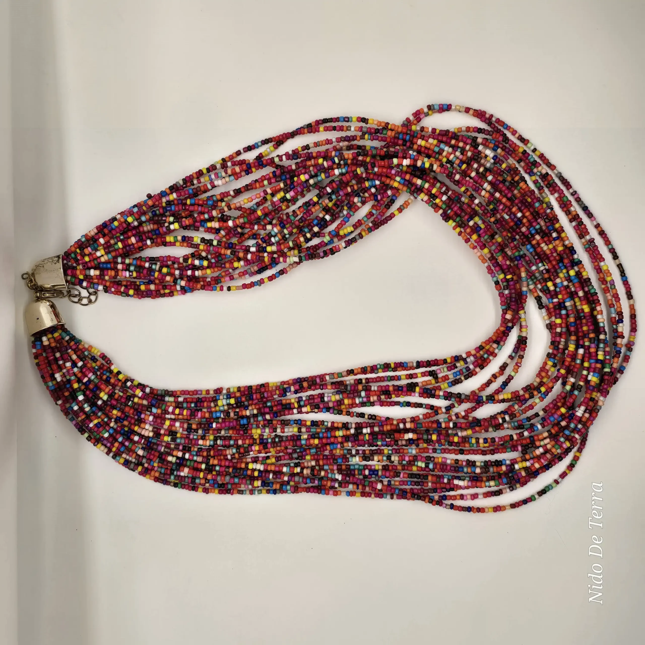Celebra la alegría y el color con este espectacular collar artesanal tipo cascada. Tejido a mano con una miríada de chaquiras diminutas, este diseño crea un efecto “confeti” vibrante y audaz, donde el color fucsia y rojo se mezcla con destellos de azul, amarillo y verde.