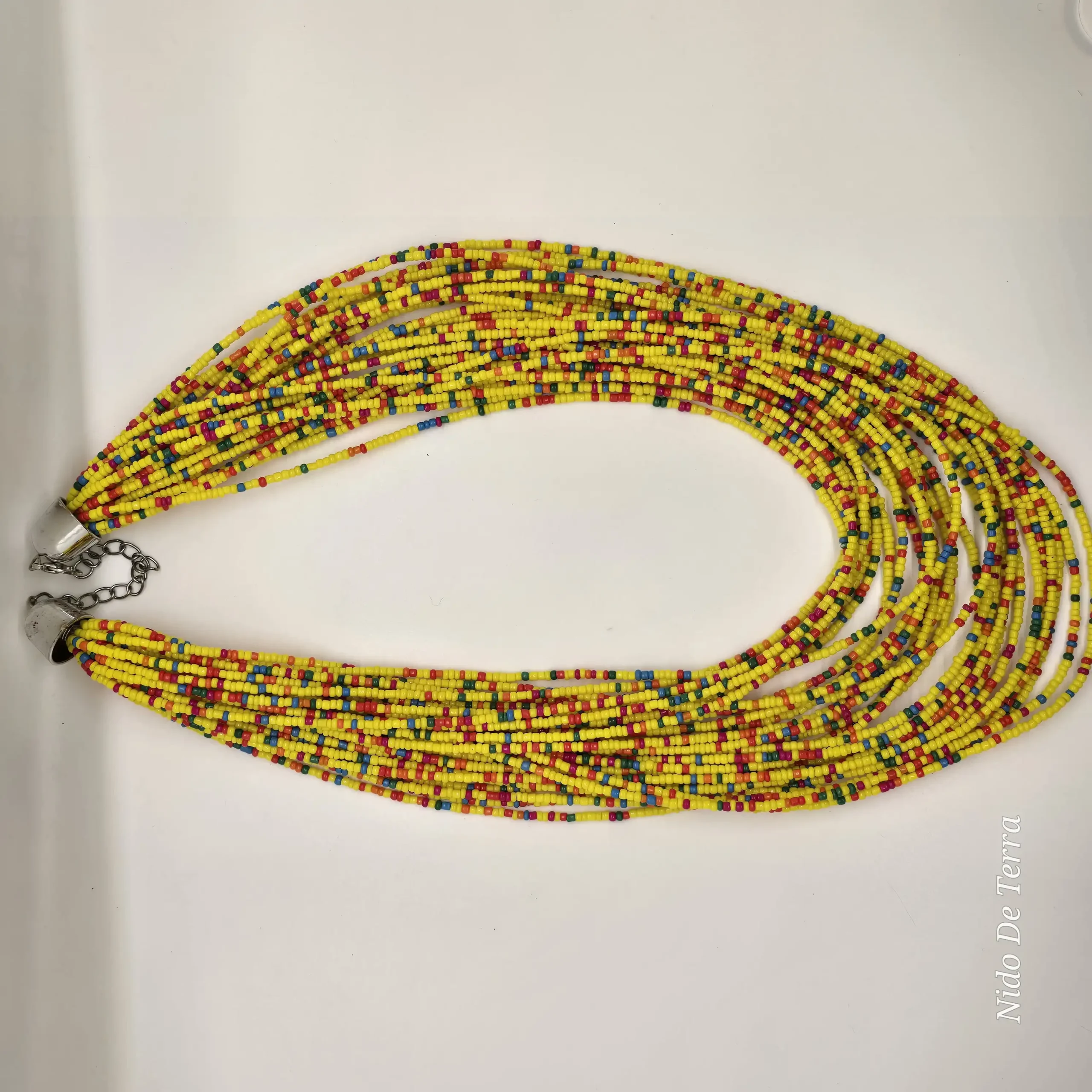 Collar artesanal vibrante de múltiples hebras con chaquiras amarillas y detalles de colores primarios.