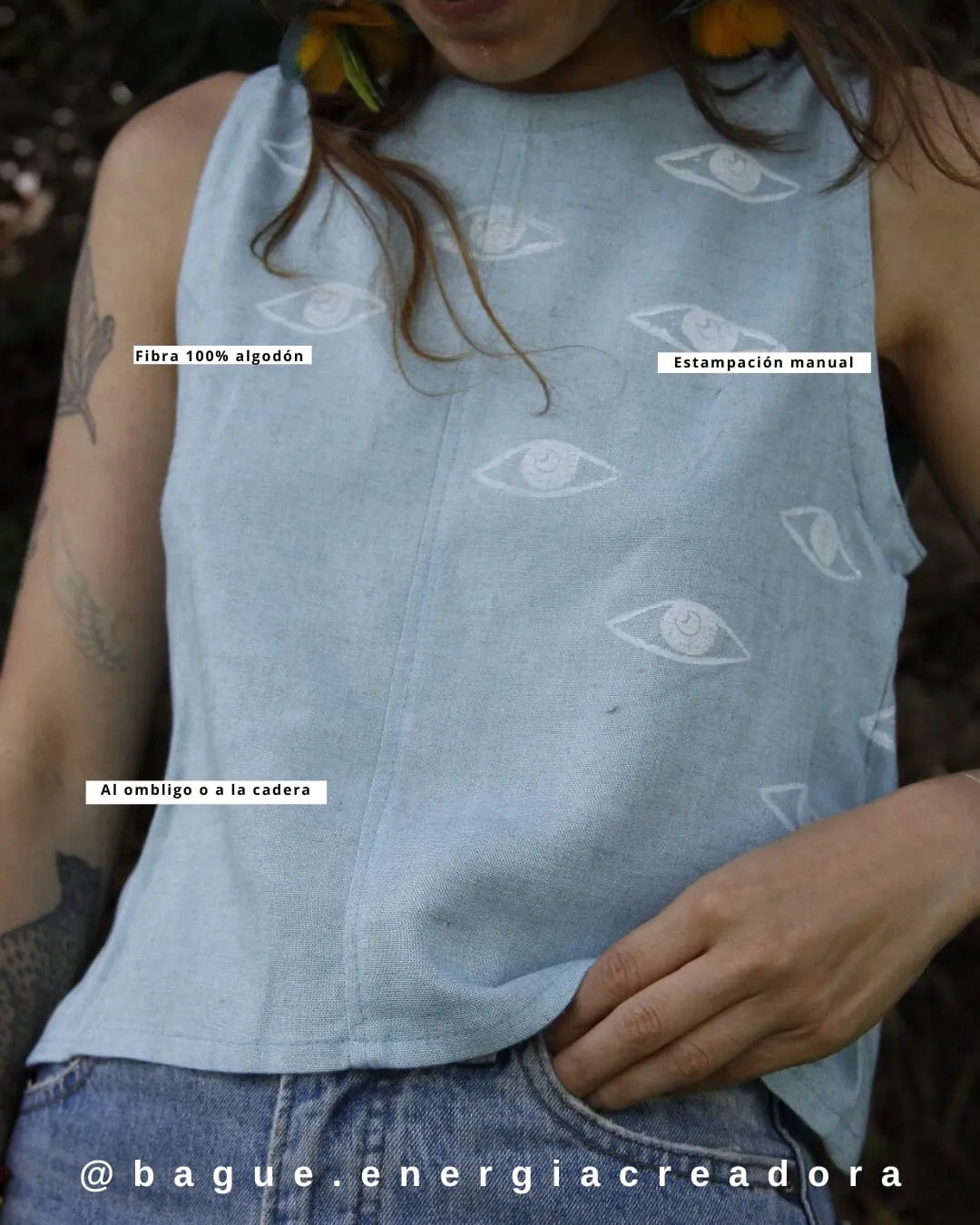 Top de algodón con estampado manual, evoca la Intuición y se ajusta al ombligo o la cadera.