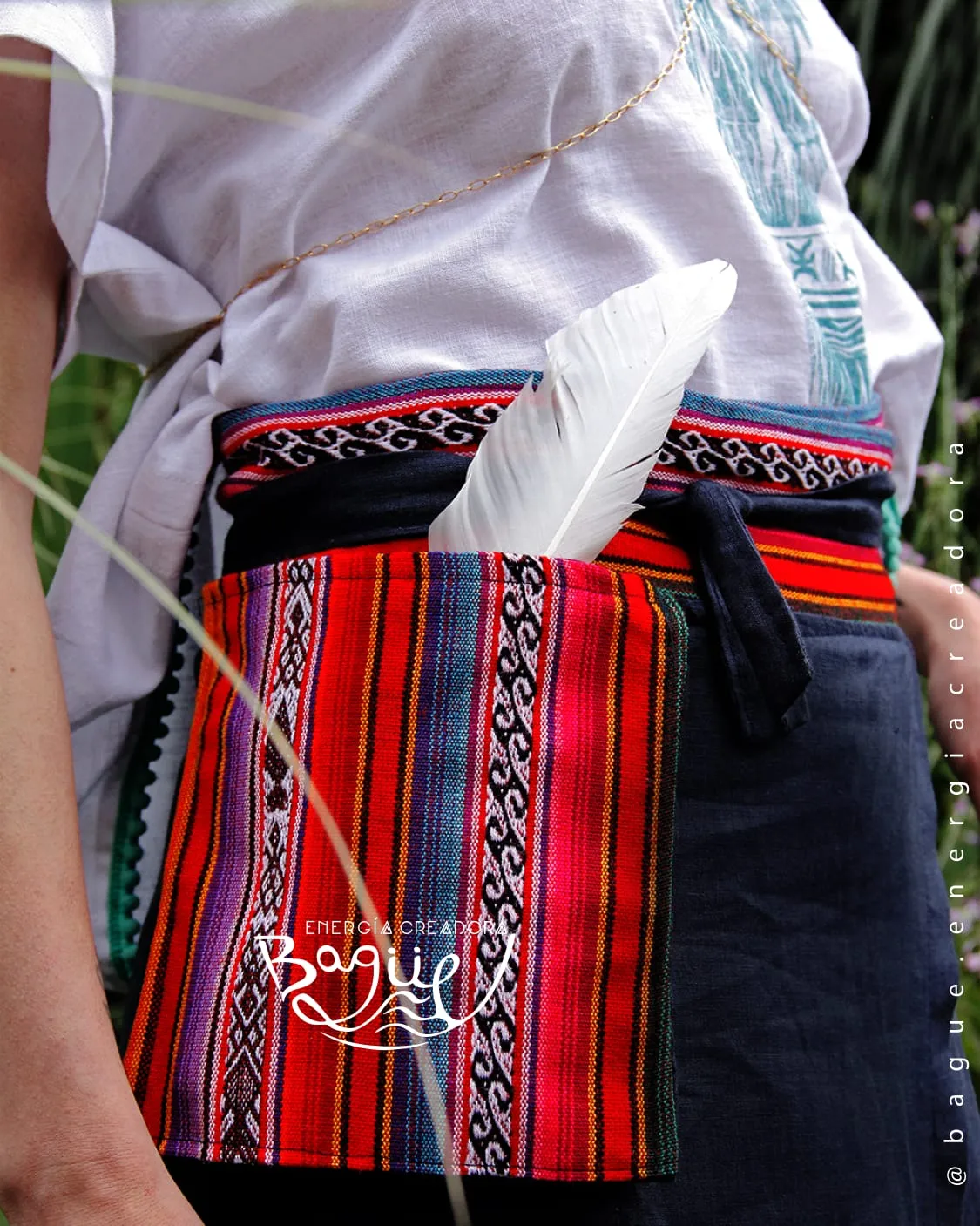 Diseño Funcional y Ritual: Incluye Chumbe con nuestro bolsillo «YO SOY MEDICINA DE AMOR» (interior, no para celular) para tu medicina personal, y un bolsillo lateral en manta para portar y compartir medicinas (plumero, plantas, cuarzos). Es perfecta para los días de Luna/menstruación y ceremonias.